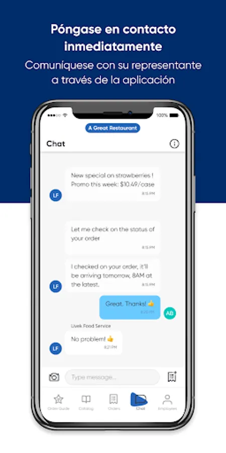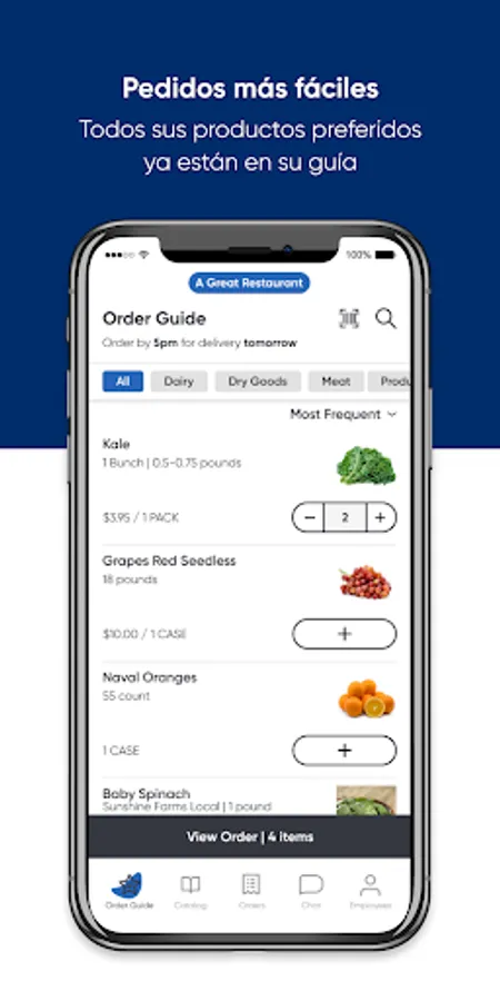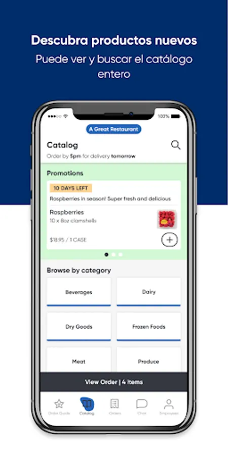 Nuestra aplicación móvil le permite navegar nuestro catálogo completo de productos, administrar y actualizar su guía de pedidos y comprar lo que necesita en el momento en que lo necesita. Es parte de nuestro compromiso de brindarle un servicio excelente.