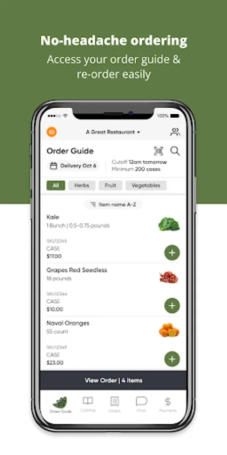 Our mobile app lets you search our complete product catalog, manage and update your ordering guide, and buy what you need at the moment you need it. It’s part of our commitment to giving you an ordering experience you’ll love.