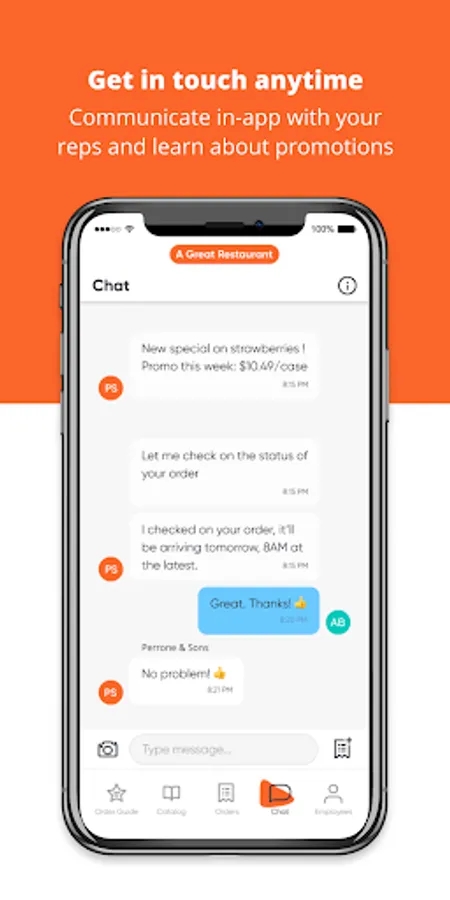- Get in touch anytime: communicate directly with your Perrone & Sons rep in the app