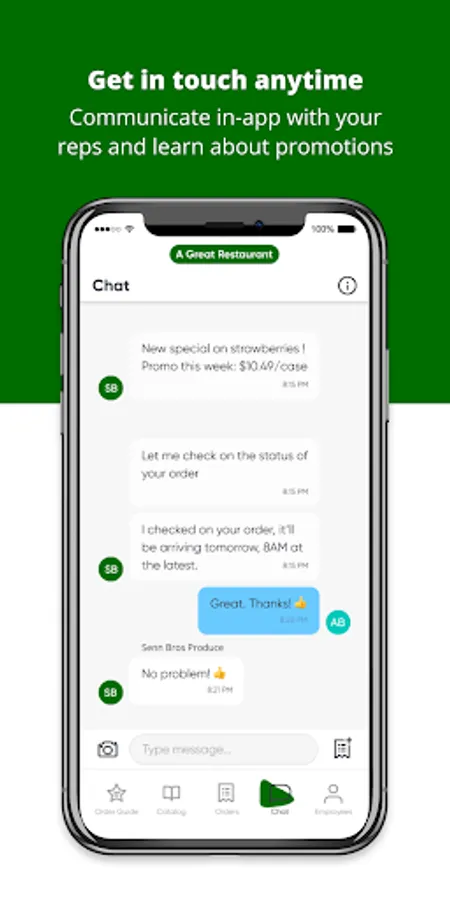 - Get in touch anytime: communicate directly with your Senn Brothers Produce rep in the app