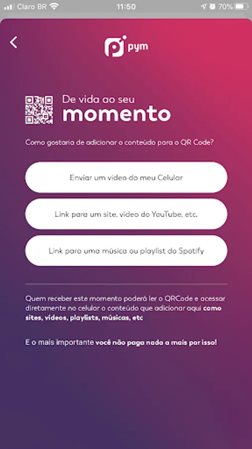 This technology allows you to insert different content profiles into your photo. You can put a video, a song, a link. With our technology we allow this content to be accessed through a single QRCODE and this QRCODE is printed on the photo. When the recipient receives, just open our application or the cell phone camera, point to the QRCODE and have access to the content that the sender has chosen.