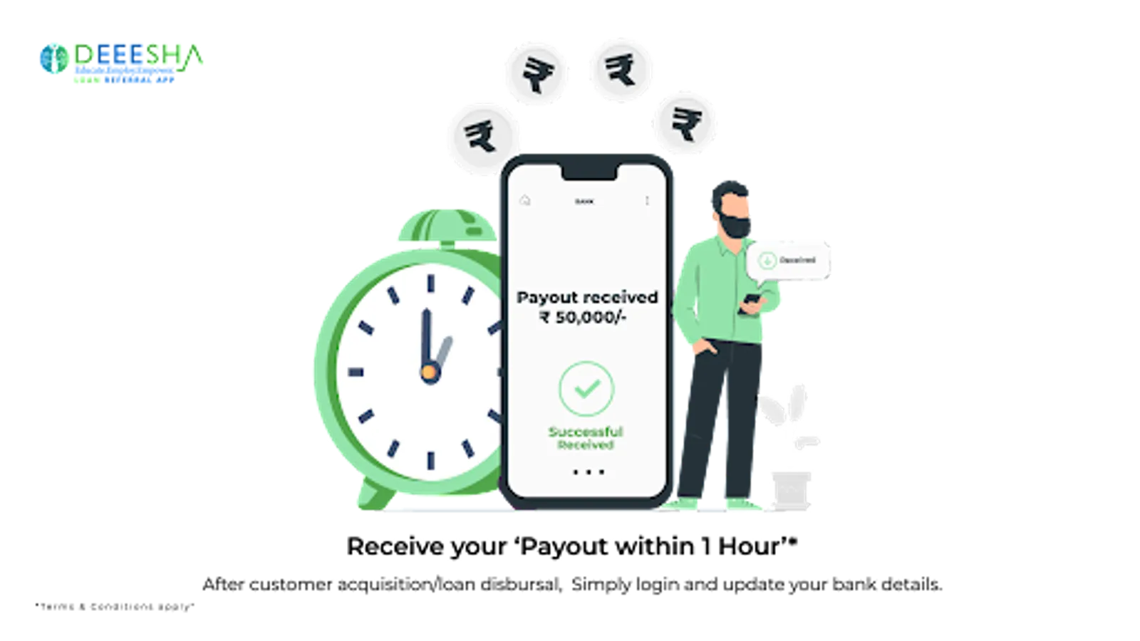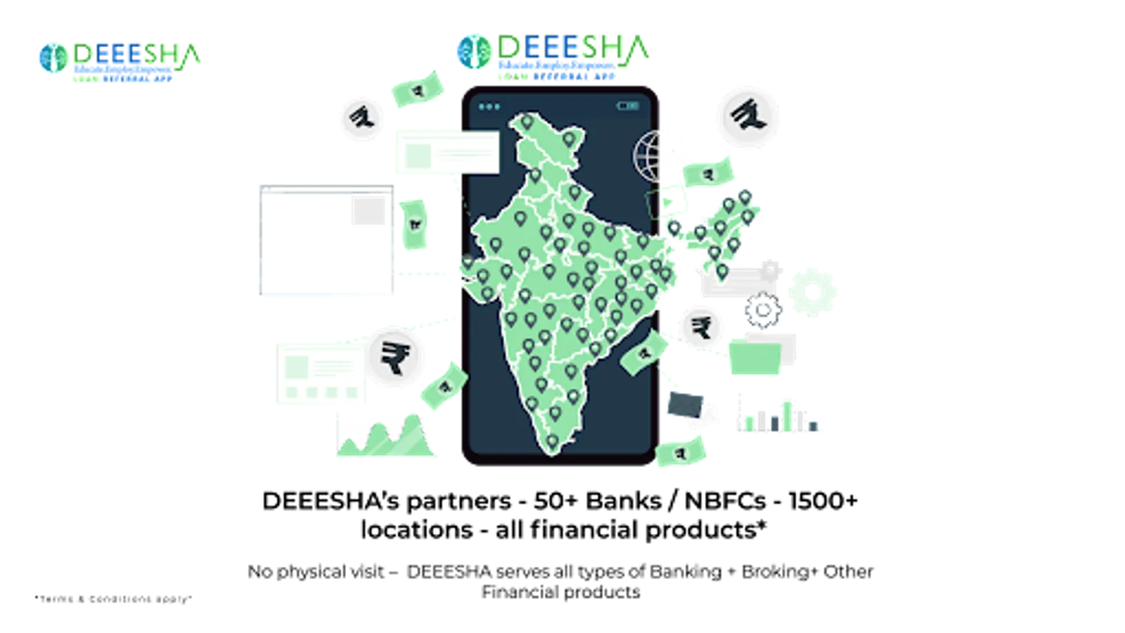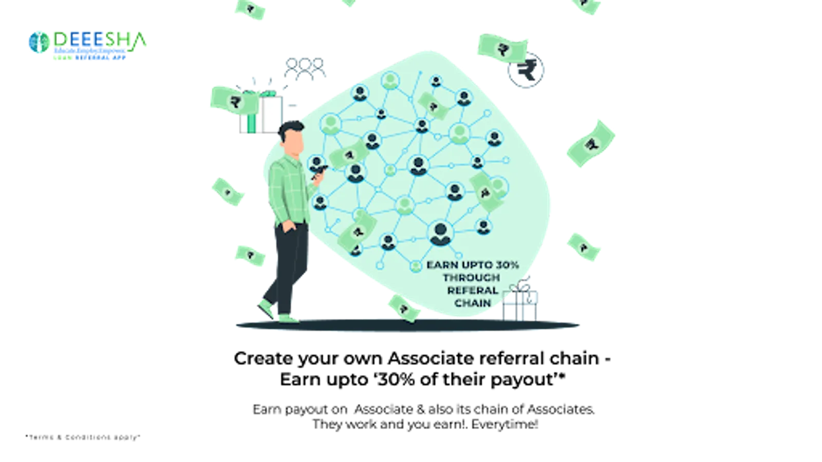 DEEESHA (www.deeesha.com) is a Digital Loan Referral Chain App offering SAME-DAY payouts (income) before 12 mid-night! to our Associates who bring Associates / Customers to us - with 1% to 2.25% payout on Unsecured Loan & 0.2% to 0.7% payout on Secured Loan disbursals. Refer associates & customers and track the status of all your loan disbursements live on our app!