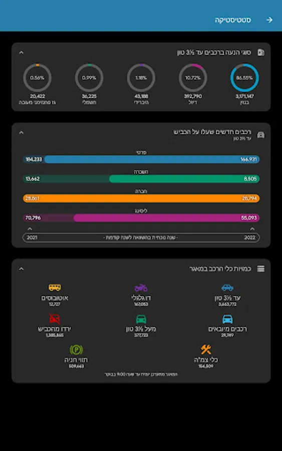 כל הנתונים המוצגים באפליקציה, נלקחים מהמאגר של משרד התחבורה: