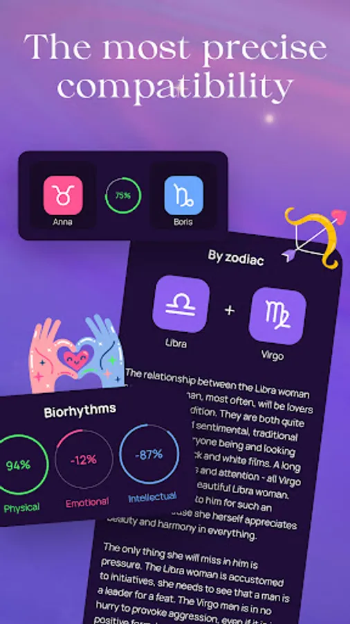 Compatibility according to the natal chart, compatibility of charts of biorhythms of partners, definition of biorhythms and critical days. Full immersion in the study of zodiacal psychic astrology, the relationship between psychology and horoscope, human design and zodiac sign.