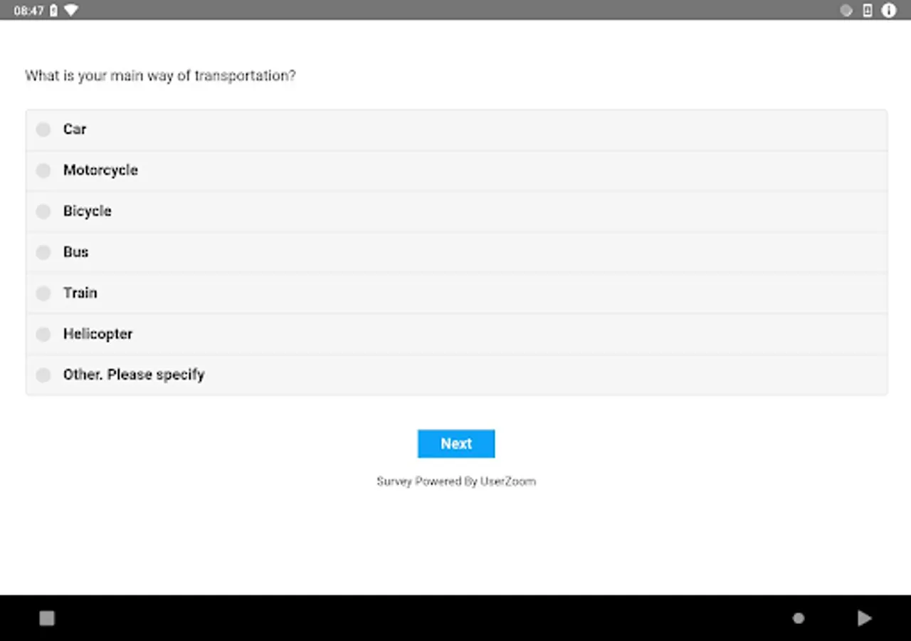 Description: UserZoom Survey Tool allows you to run UserZoom Mobile Surveys. UserZoom Surveys are under email invitation only. When you receive an email invitation link and select it, UserZoom Survey Tool app will automatically launch and let you complete the survey. In order to be invited to a survey, you have to be registered in an online panel.