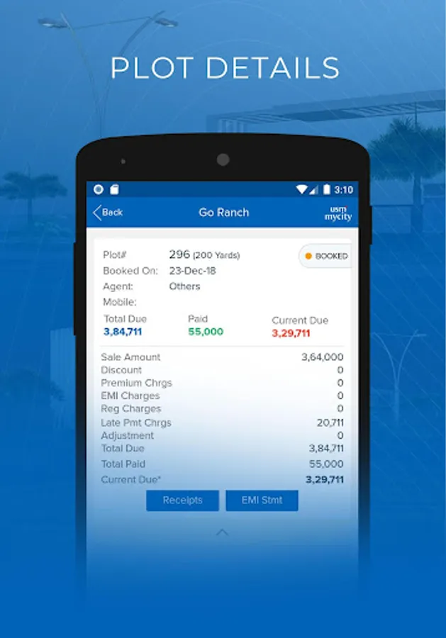 With this app customers can see their booking details along with amount paid and due with receipt details. They can also see current availability of plots in any of USM MyCity projects. Current development work status of all projects is also updated through the app.