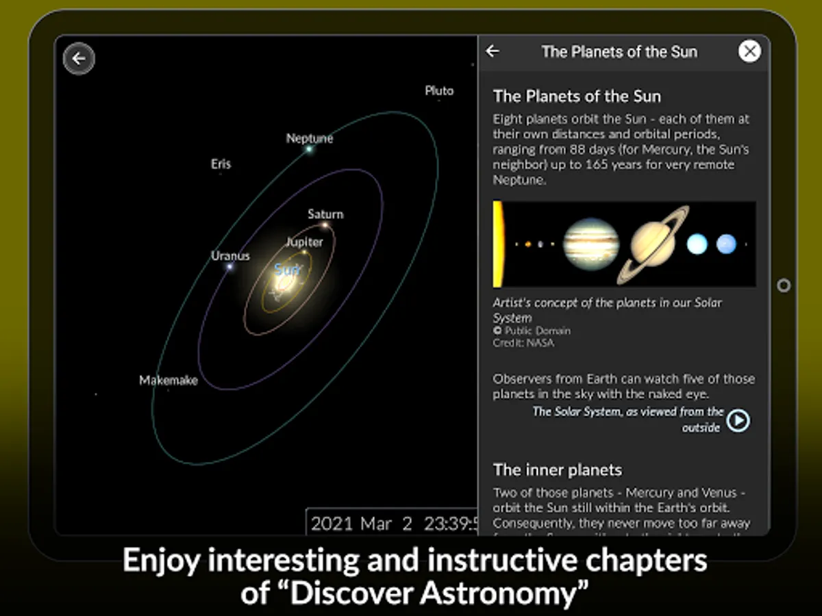 Your thirst for knowledge is not yet satisfied? With the premium subscription, you can activate additional spaceflights as well as additional knowledge sections of "Discover astronomy" - and you can travel through space free of advertising. Moreover, a brand new Guided Tour of the U.S. MARS 2020 mission is available. It includes images and animations of the landing on Mars, as well as of the environment at the landing site of the Mars rover Perseverance.