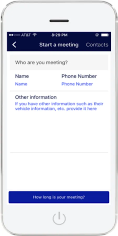 “Start a Meeting” allows the user to set meeting details and start a meeting timer from 15 minute to 120 minutes ( 2 Hours ) Once activated the smart phone will send to our system your GPS location, the amount of time you have set it for along with the meeting details. The time will be kept in our system so even if the phone is turned off or destroyed we already have your data. If the timer expires a Duress alarm activation will occur. The time can be extended and or ended with a valid safe word.