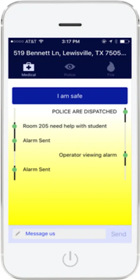 The “Send Help” feature, when activated, will send a duress signal to our UL listed central monitoring station. Simply swipe your finger across the “Send Help” button and the app will send your GPS coordinates and trigger a duress signal at the central station. At the bottom of each screen there is a text area for you to share more information about the alarm with our central station. Once you trigger the alarm you will also find three buttons, Medical, Police, Fire which you can select to transmit specific information about the type of assistance needed.