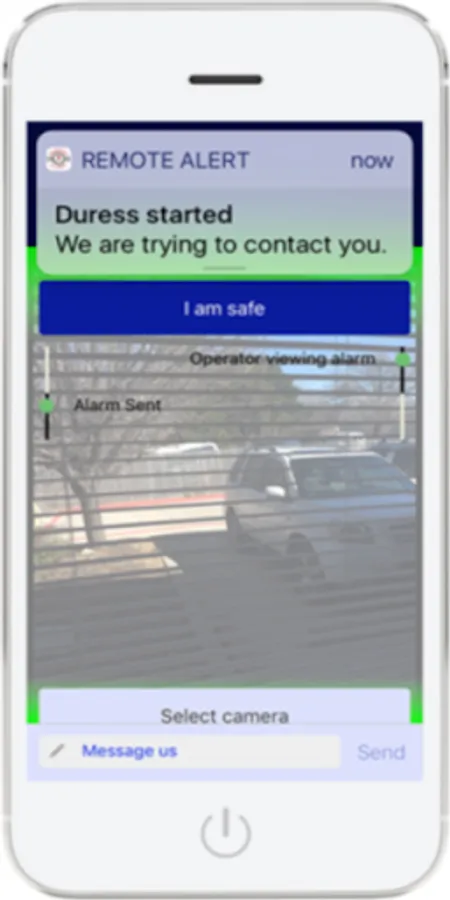 At the start of the timer, which can be set from 5 minutes to 4 hours, the smart phone will send to our system your GPS location and the amount of time you set. The timer triggers the event in our software at the central station and is logged so even if the phone is turned off or destroyed the timer is still active in our system. If the timer expires, a duress alarm activation will occur. The timer can be extended and or ended with a valid password.