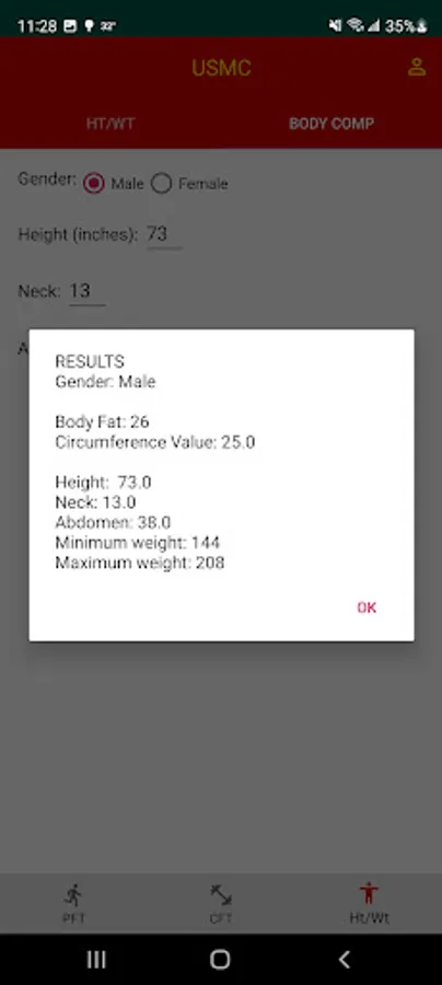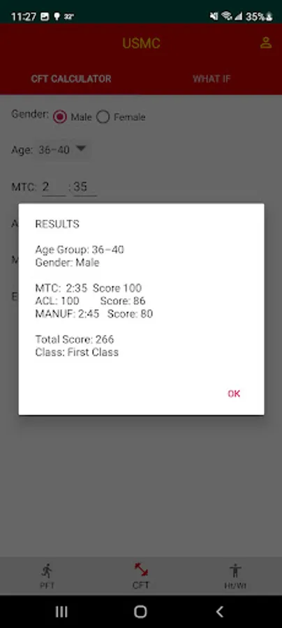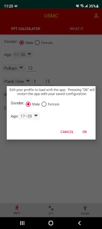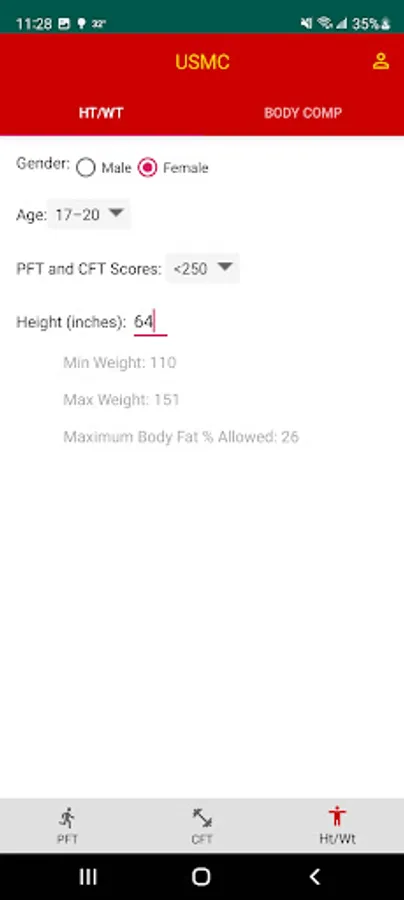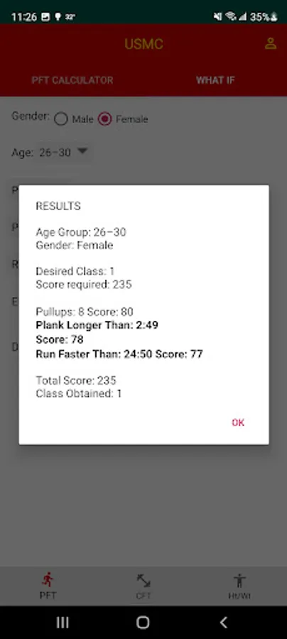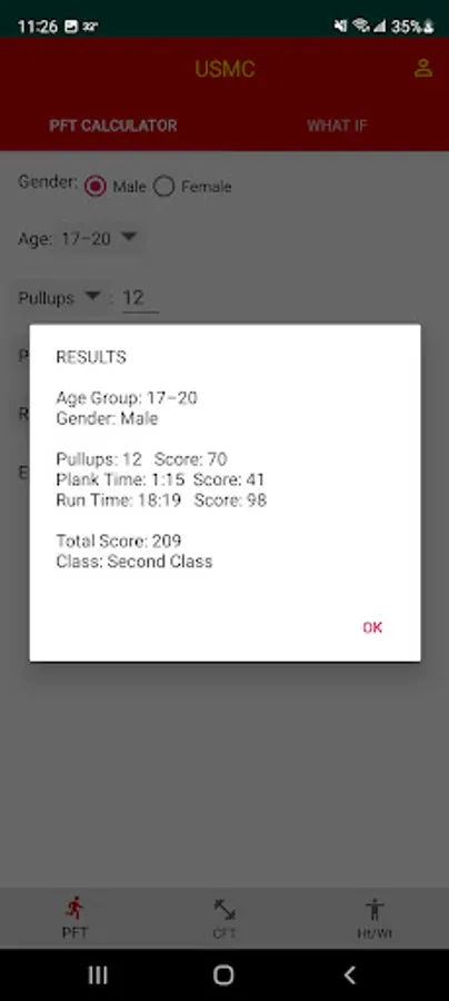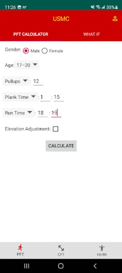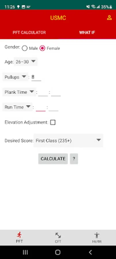 Updated simple to use app to calculate Marine Corps PFT and CFT scores, and Body Fat percentages. Includes pullups/pushups, crunches, and run/row options with age, gender, and elevation choices. Updated to the 2022 planking standards.