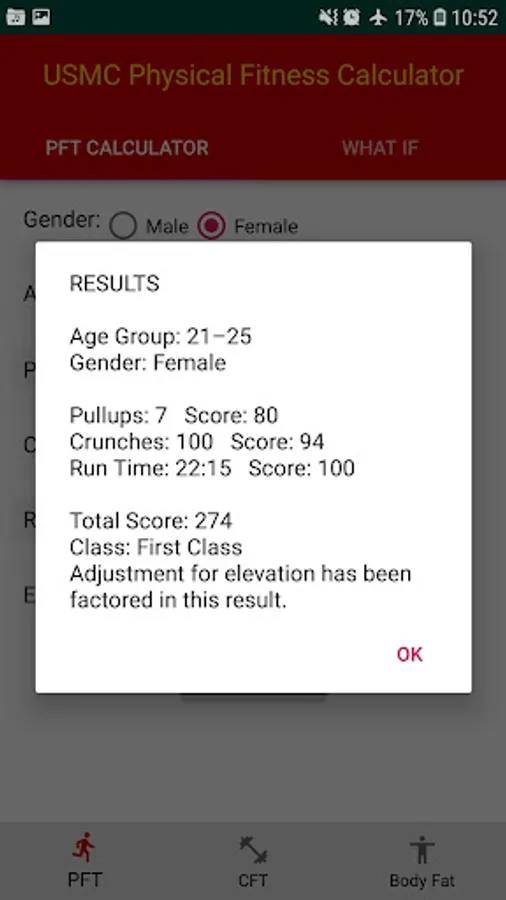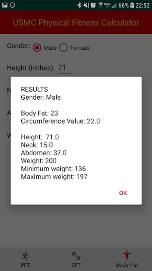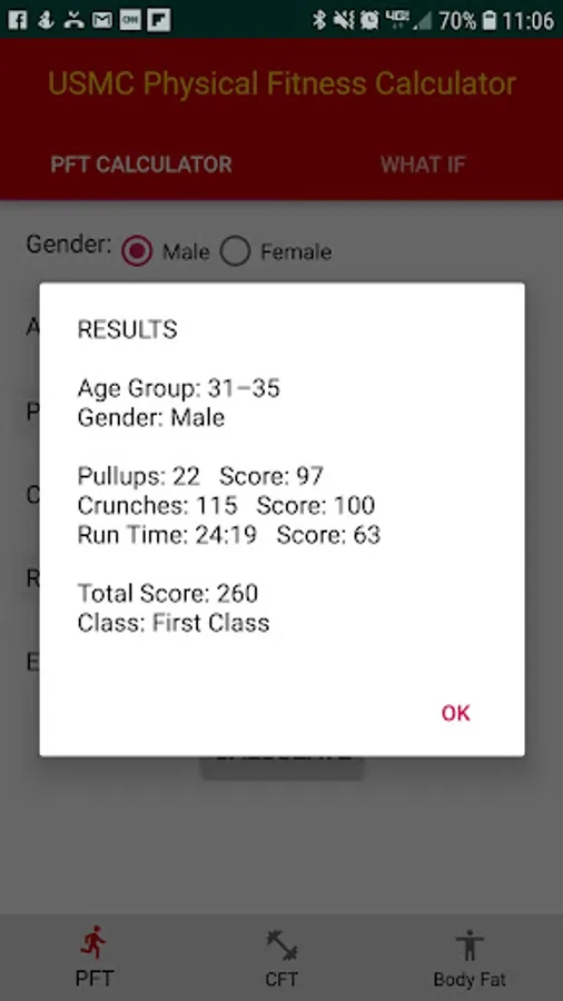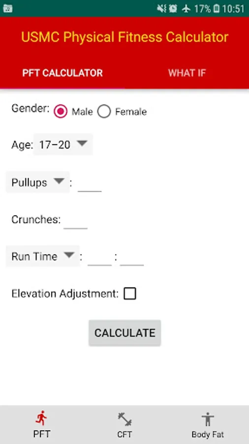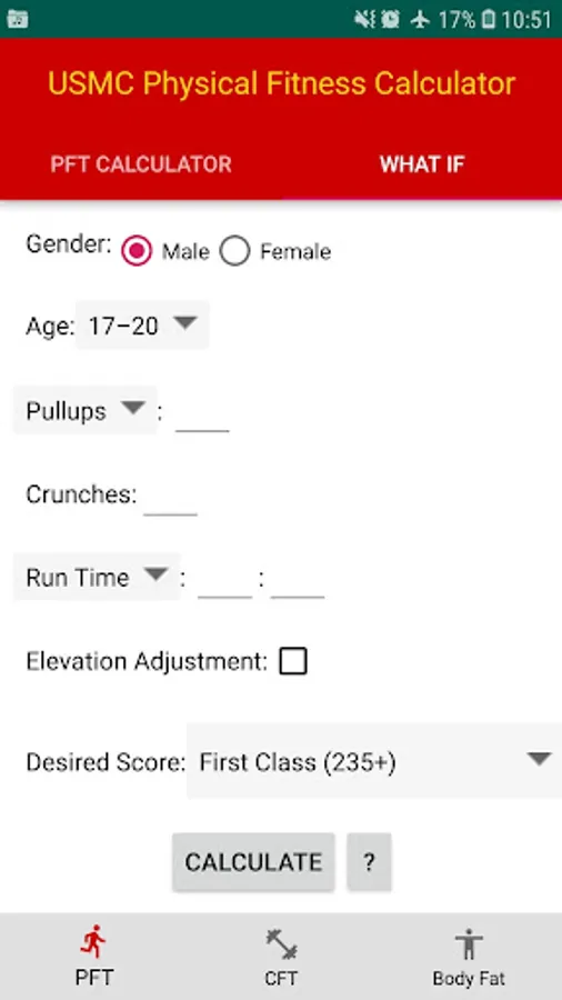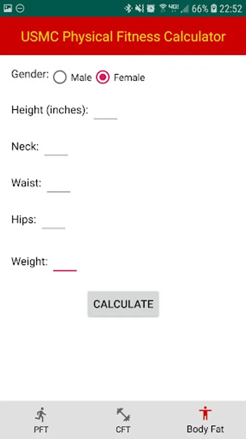 Updated simple to use app to calculate Marine Corps PFT and CFT scores, and Body Fat percentages. Includes pullups/pushups, crunches, and run/row options with age, gender, and elevation choices. Updated to the 2022 planking standards.