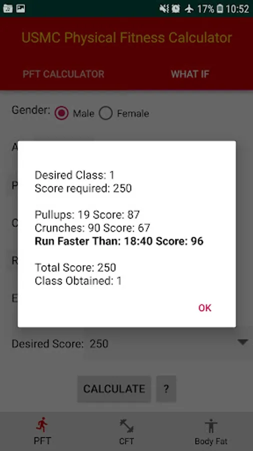 Includes a "What-if" calculator for the PFT and CFT which allows you to input 0, 1, or 2 scores and the calculator will determine what results you need to achieve to obtain a certain class.