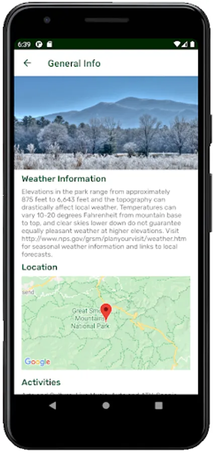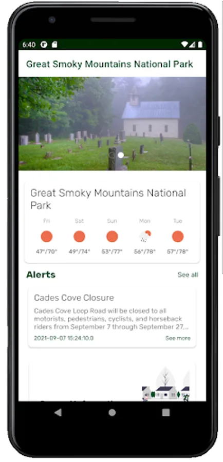 A Great Smoky Mountains National Park mobile application that allows for use offline. Once the application is downloaded it stores all park information locally to allow for offline use. Weather, webcams, park entrance times and dates, as well as park fees are all included in the application.