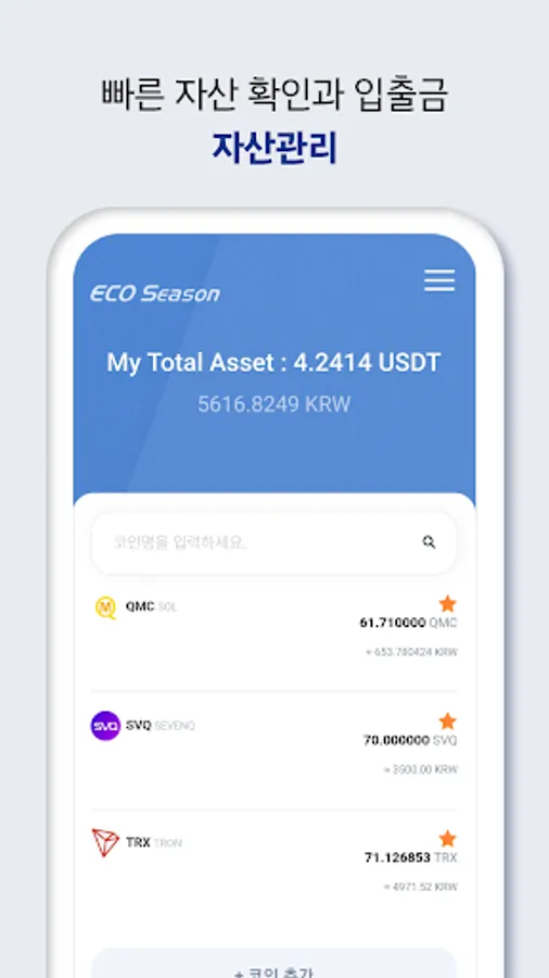 ■ Ecoseason Wallet is a service that allows you to safely store QMC and SVQ cryptocurrencies issued by Ecoseason companies and conveniently use deposits and withdrawals.