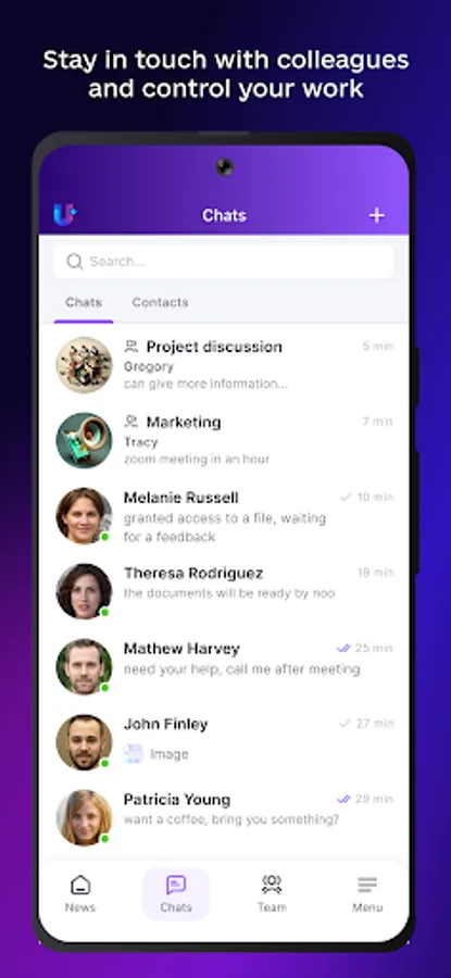 Use the Employees list to quickly find the right colleague and write to them. Keep in touch in personal chats to resolve any issue in the familiar form of a convenient messenger. Coordinate teamwork with Uspacy. Create personal and group chats with emoji support and file uploads.