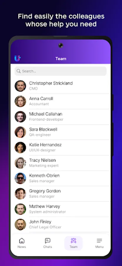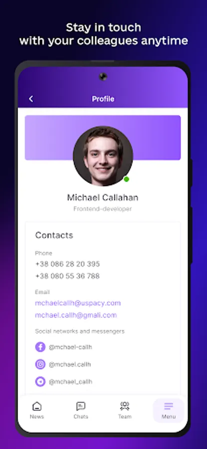 Start by creating a profile and filling it with information so that your colleagues can learn more about you. There are two types of profiles in Uspacy. A short one, which contains basic information about the employee and contacts for communication. A full profile reveals the user's personal information, date of birth, preferences, interests, and shows a photo.