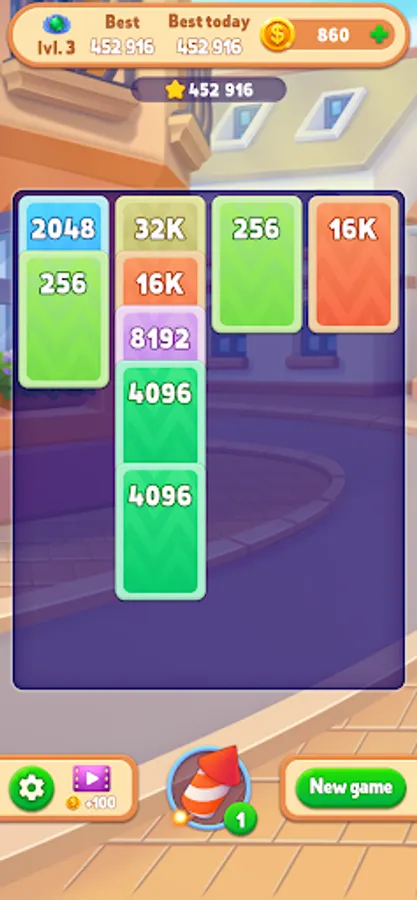 Tap the screen or drag the cards to move them. When two cards with the same number touch, they merge into a larger number card. Every time you move cards and don't merge them, a new row of cards appears. Be careful not to stack your cards too high or you will lose! Collect the 2048 card and keep playing for a high score.
