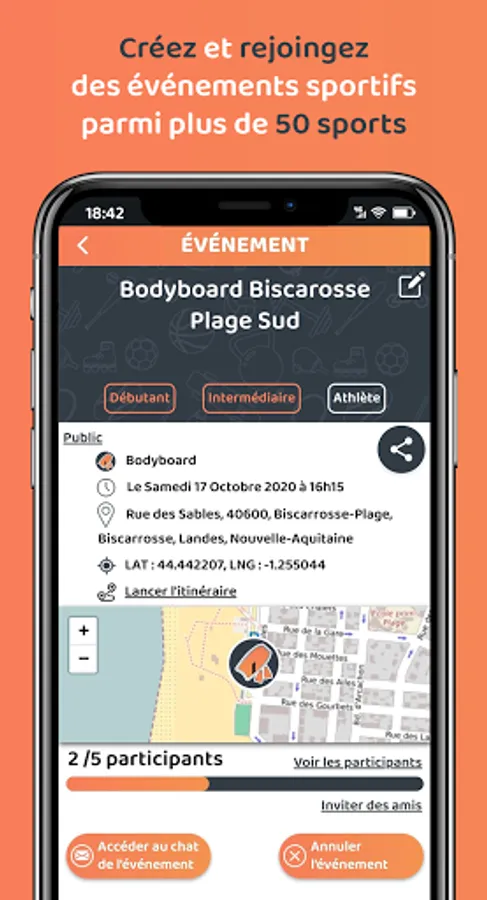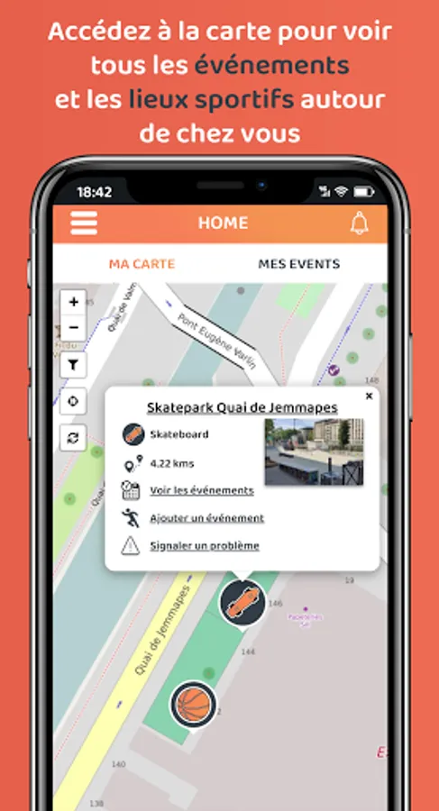 Create and join sporting events at a location displayed at any other public location on the map. Indicate the sport, level, date, time, meeting place and number of participants and that's it!