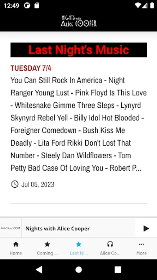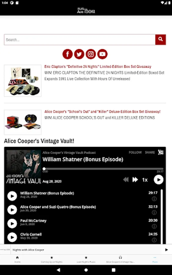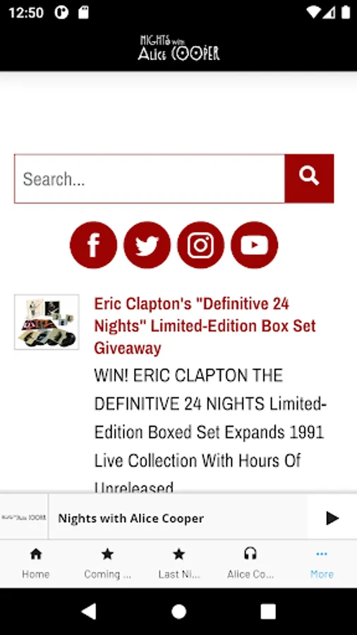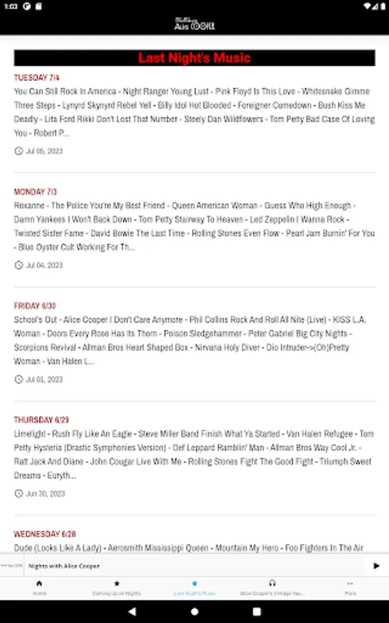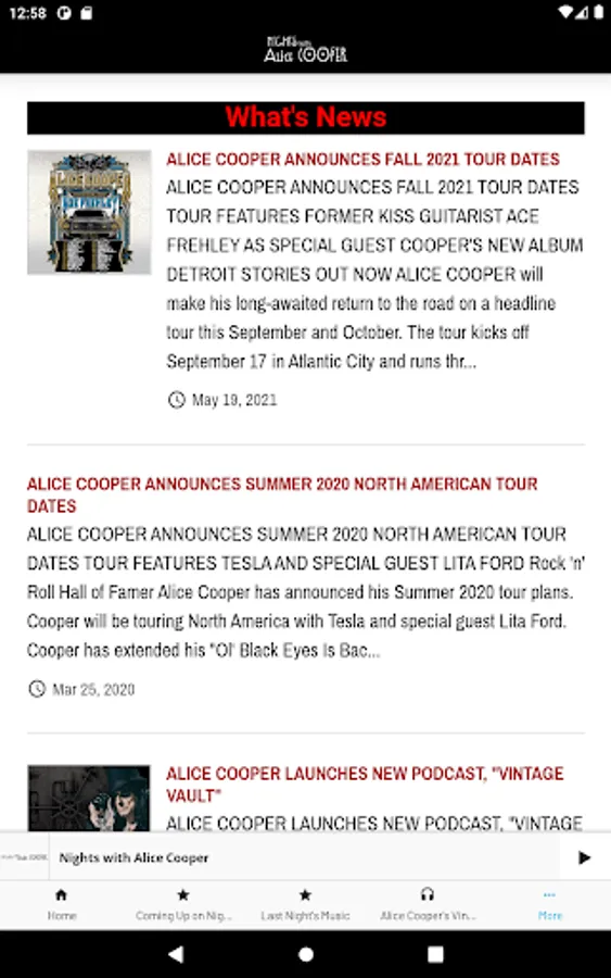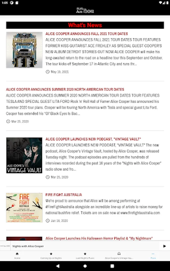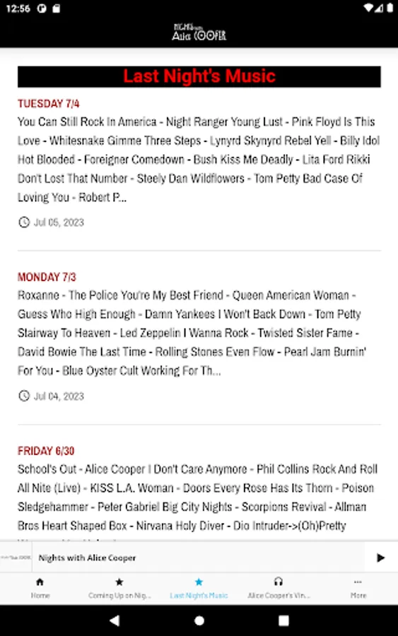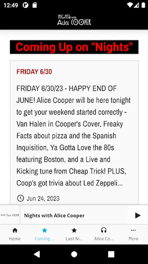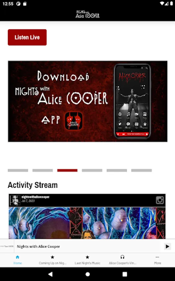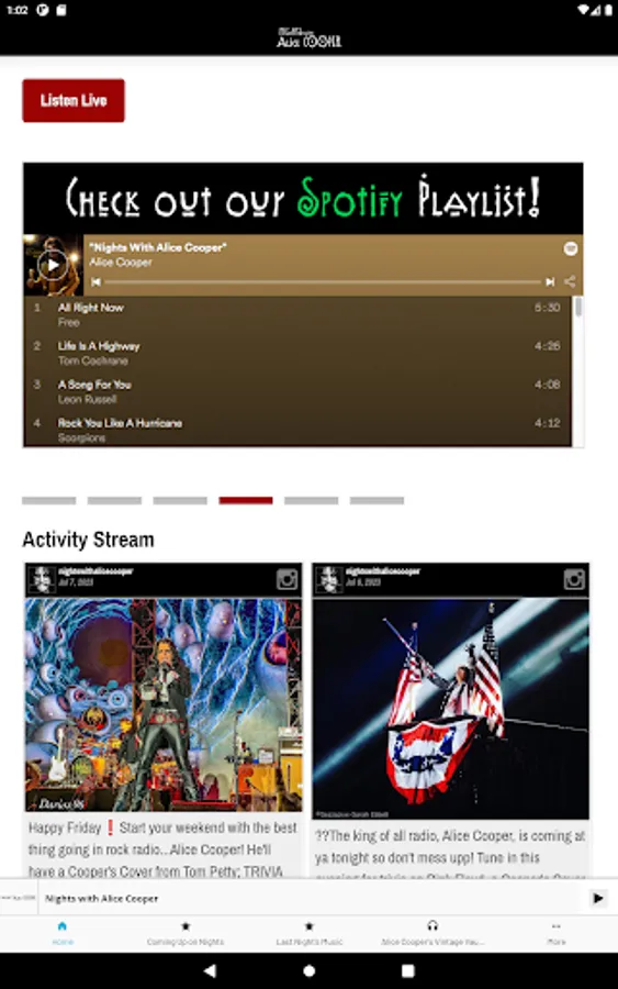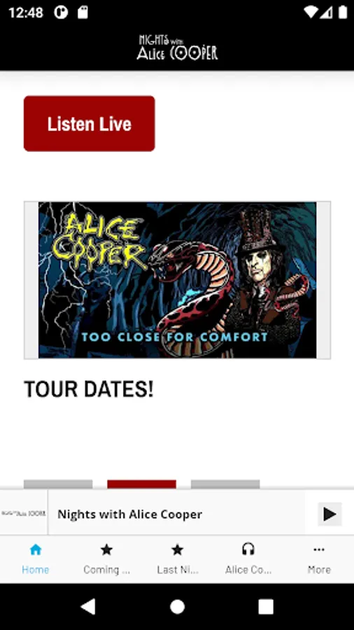 The home of the legend Alice Cooper's radio show, Nights with Alice Cooper, and the twisted world he has created! Music, mayhem and more on this free iOS and Android app that provides listeners with a stream of Nights With Alice Cooper program content on demand. Download the app today for access to exclusive content including interviews and performances, tour information, photos, videos and more!