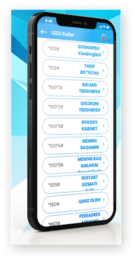 Bu ilovada O'zbekistonda mavjut bo'lgan barcha uyali aloqa operatorlaring (Mobiuz [UMS, UCell, Beeline va UzMobile) USSD kodlarini jamlangan. Ilovadan foydalanib, siz hozirda telefon raqamingizga qaysi pullik xizmatlar yoqilganligini ko'rishingiz, ularni o'chirishingiz yoki qo'shimcha hizmatlarni yoqishingiz mumkinligini, hamda mavjqni boqalar bonus da