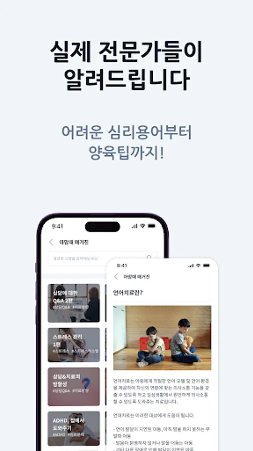 No more wandering around with simple opinions from non-experts or questionable internet information searches. Child psychology experts in various fields, such as clinical psychology, play therapy, and art therapy, provide a variety of information, from explanations of difficult psychological terms to parenting tips.