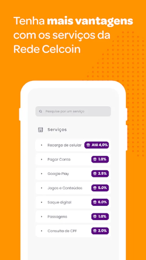 With the Celcoin Network, you get bonuses with every cell phone and game recharge, gift cards and when paying and receiving bills online. It's a free virtual account where you can still pay the bill with your account balance or with a credit card using our Poderoza machine. Download a free app and have multiple services!