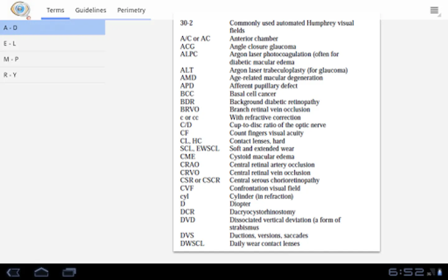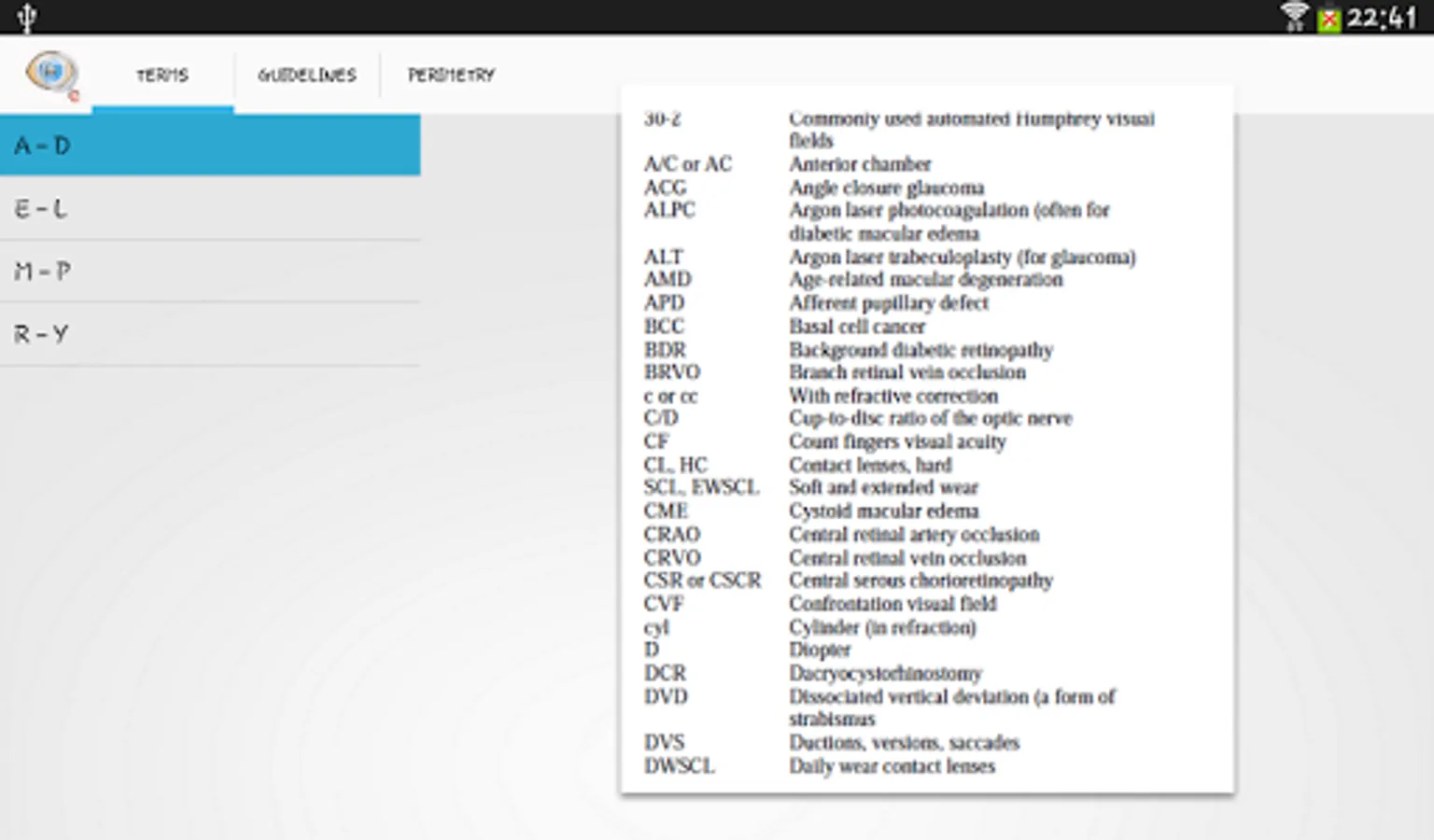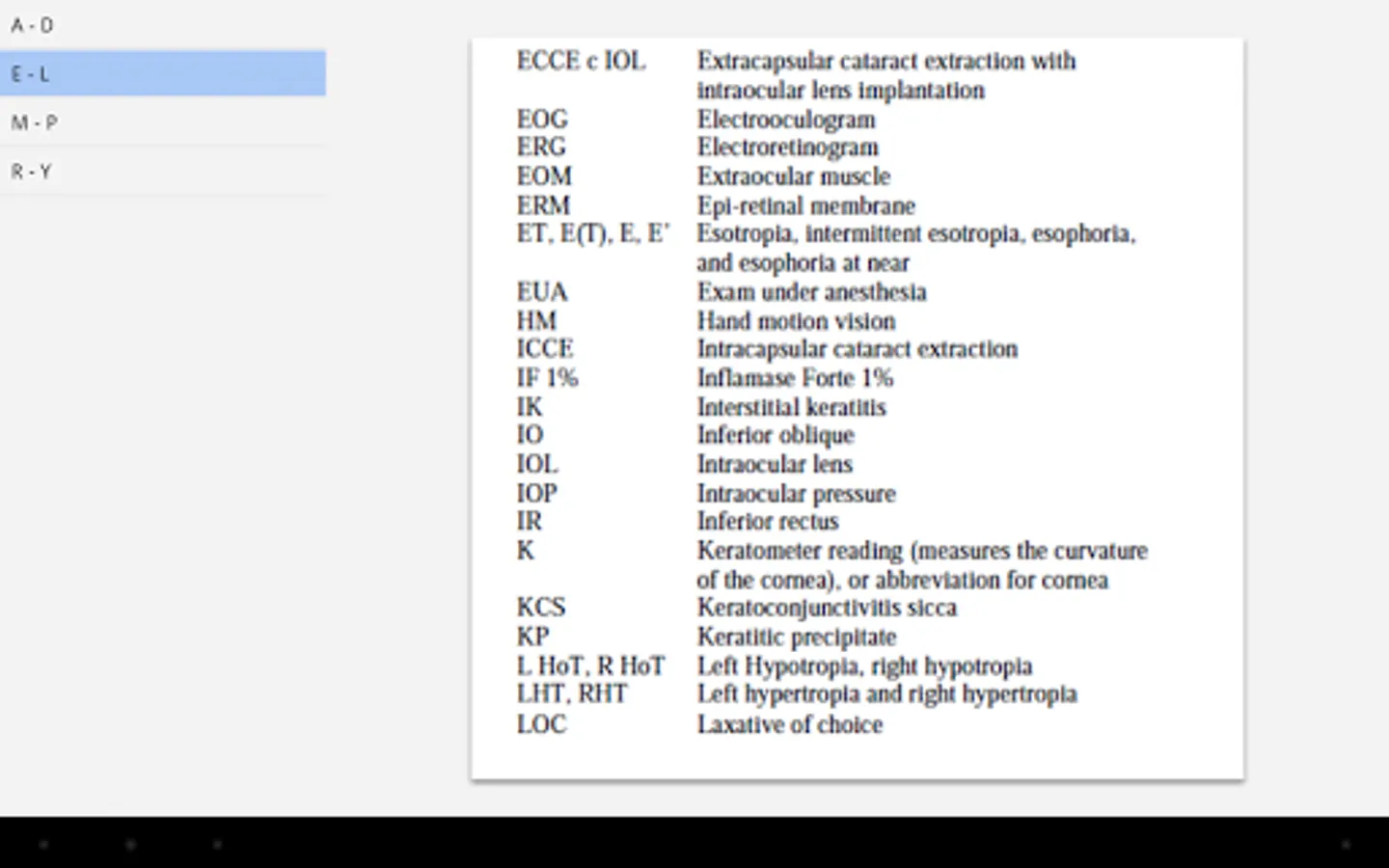- Terms: hundreds of terms frequently used by ophthalmologist; sorted by alphabet