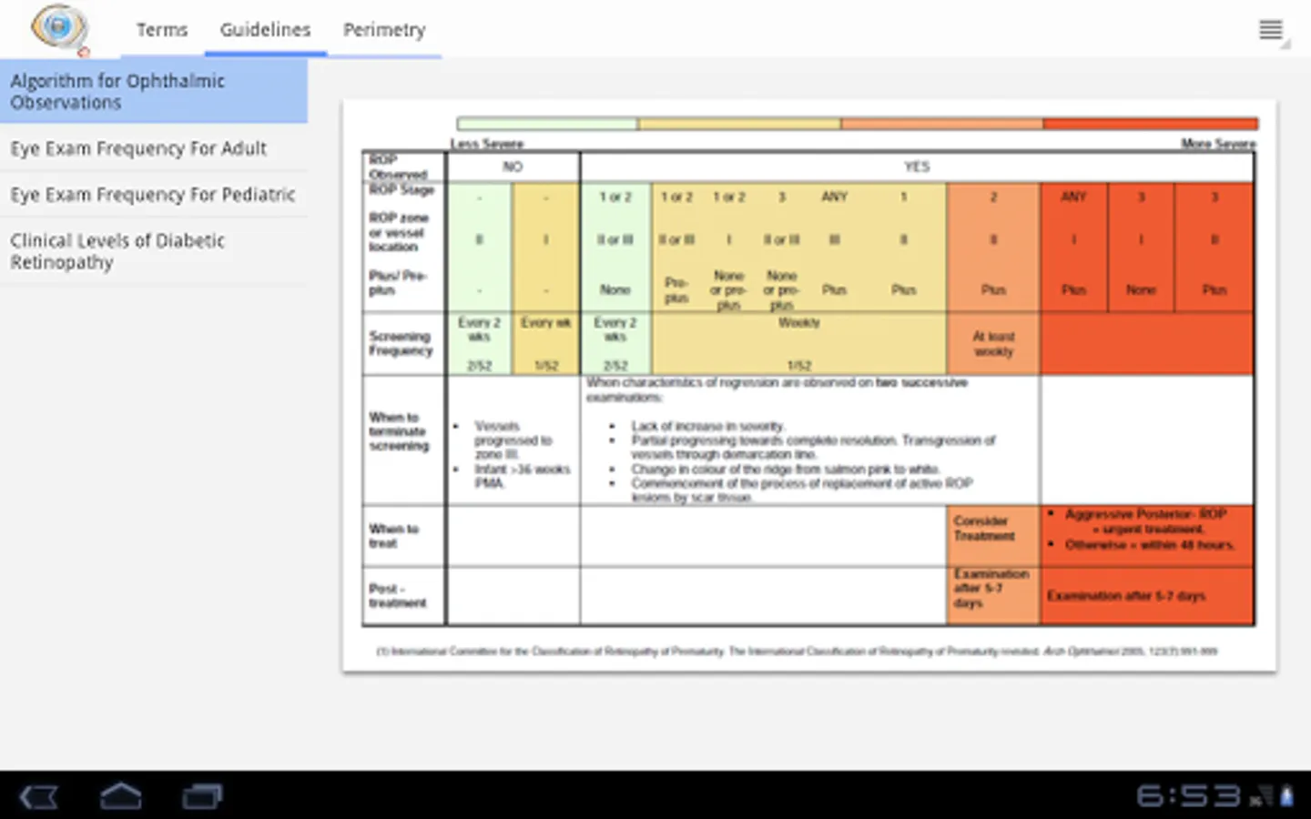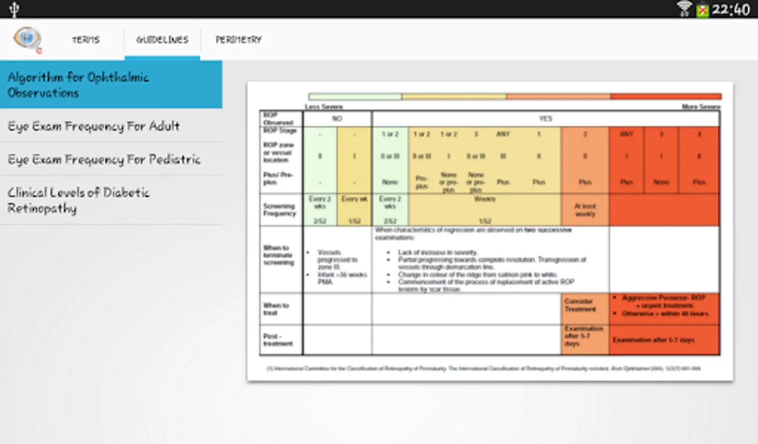 - Guidelines: Algorithms, Eye Exam Frequency, Clinical Levels of Diabetic Retinopathy and more to come in next versions