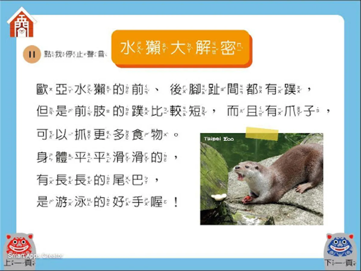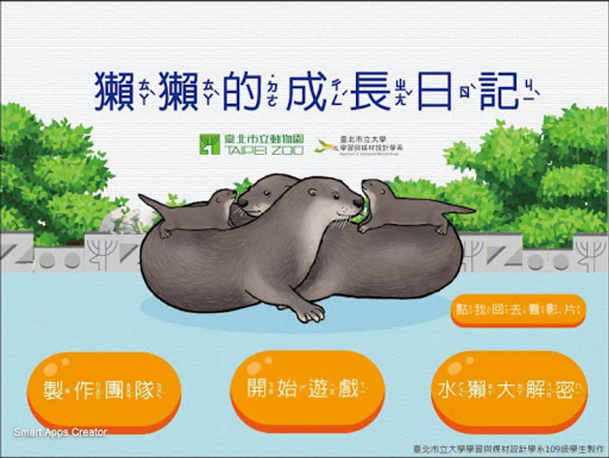 進入此APP,會先播放一個小影片,說明水獺是從金門來到台北市立動物園,且讓使用者能進入遊戲的情境當中。關卡分為五關,依次為介紹水獺的居住環境、特徵、食性、生育、保育,透過問答與拖曳小遊戲,讓使用者可以去思考相關問題,並且學習到知識。