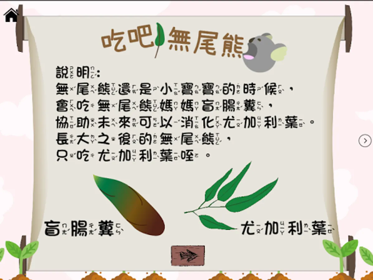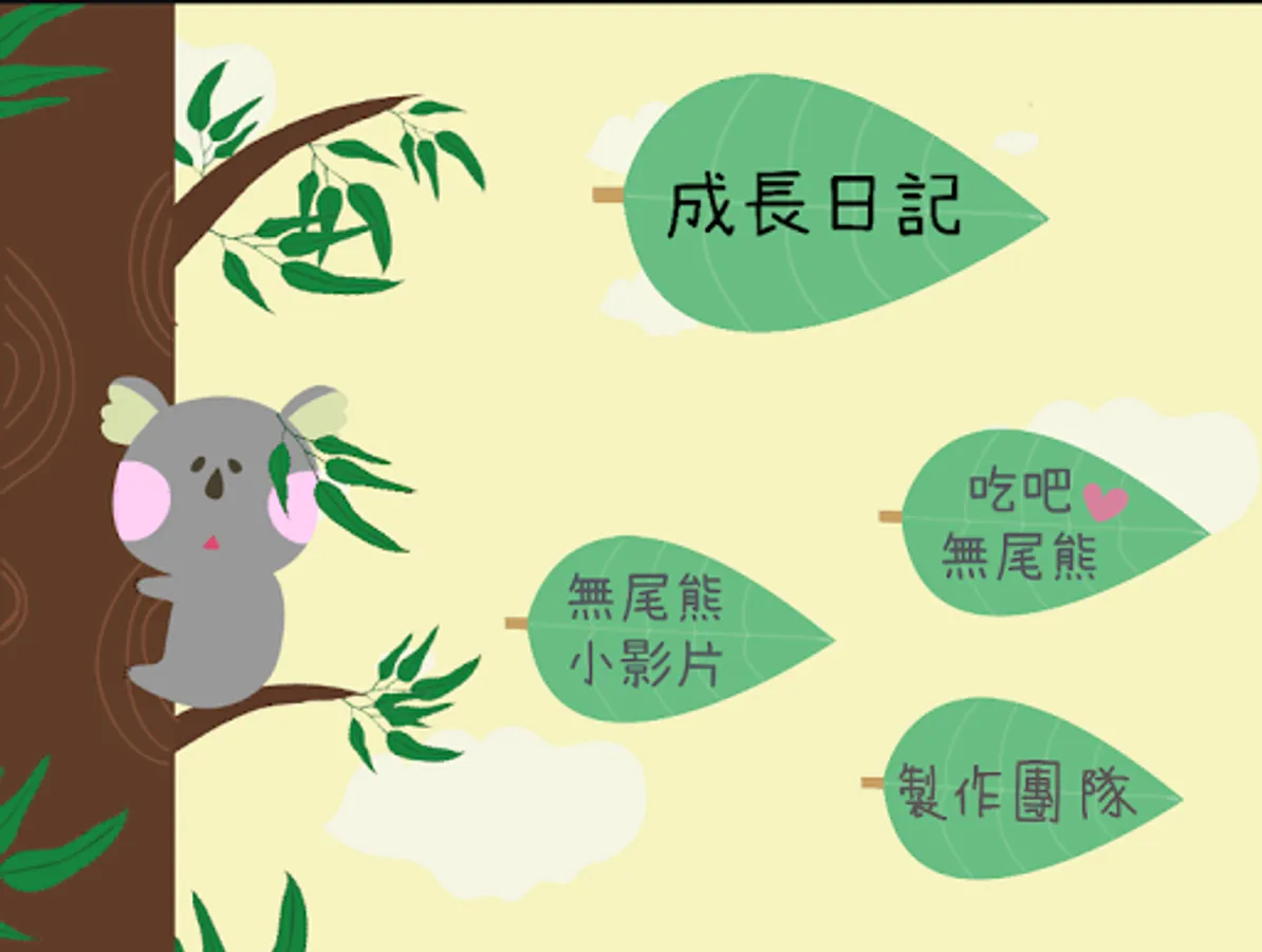 本團隊運用影片、動畫來加深使用者對於無尾熊動物的生長歷程、生活趣事的了解。透過餵食遊戲的方式,讓觀眾了解各階段無尾熊的食性,另外也設計了Q&A的問答小遊戲來增進民眾對於無尾熊的認知,讓民眾可以更深入且正確的認識無尾熊。