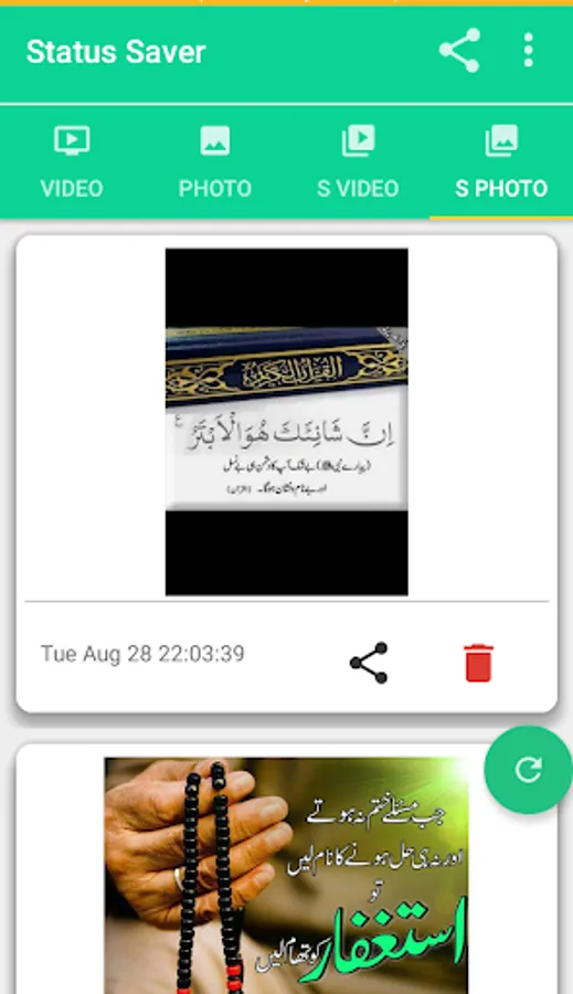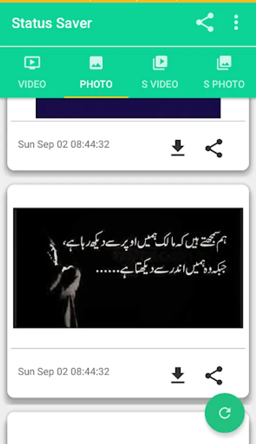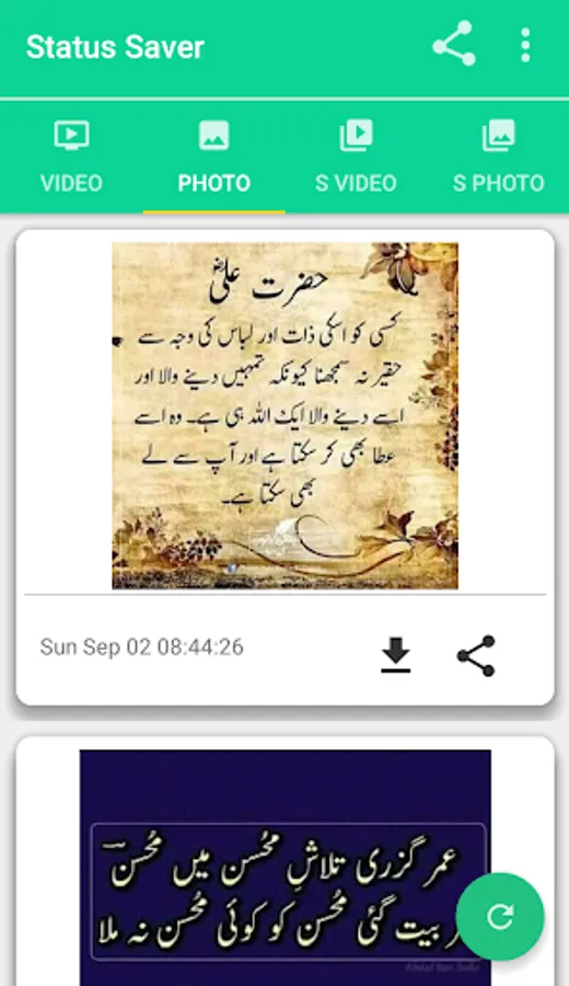 ✔ Saved Status is shown under 'S Video' and S Photo section in the Status saver app for Whatsapp.