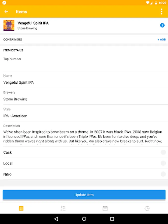 - Menu Management: Create, edit, and manage your menus, including sections, beers, and containers in real-time, anywhere.