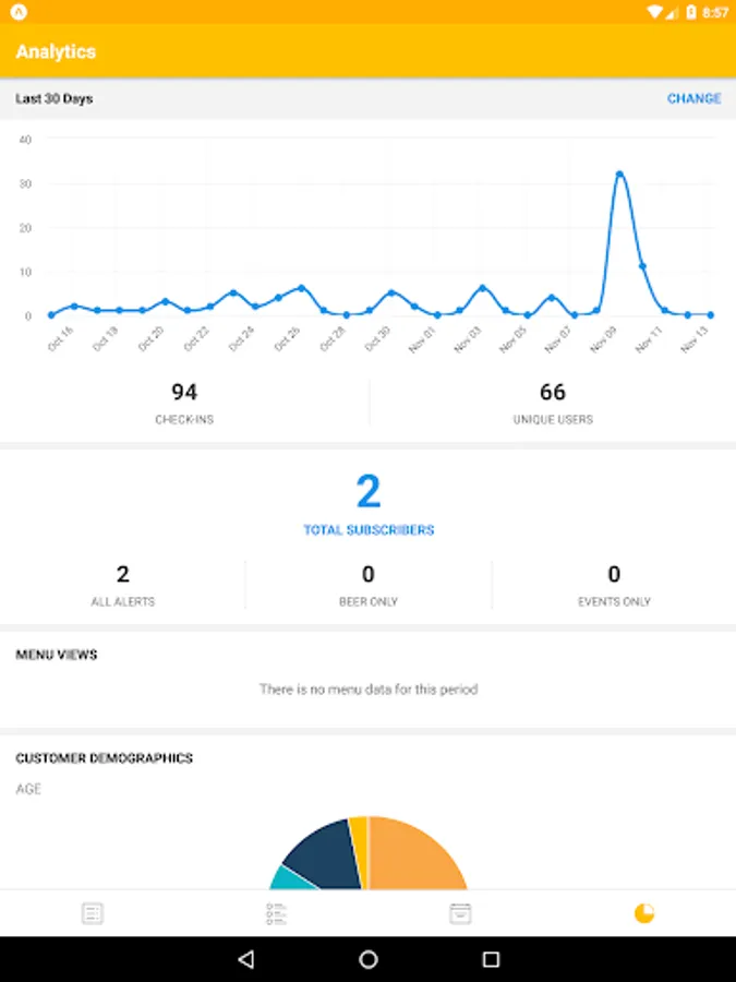 - Analytics: See real-time analytics about your location including check-ins, menu views, demographic information, and more.