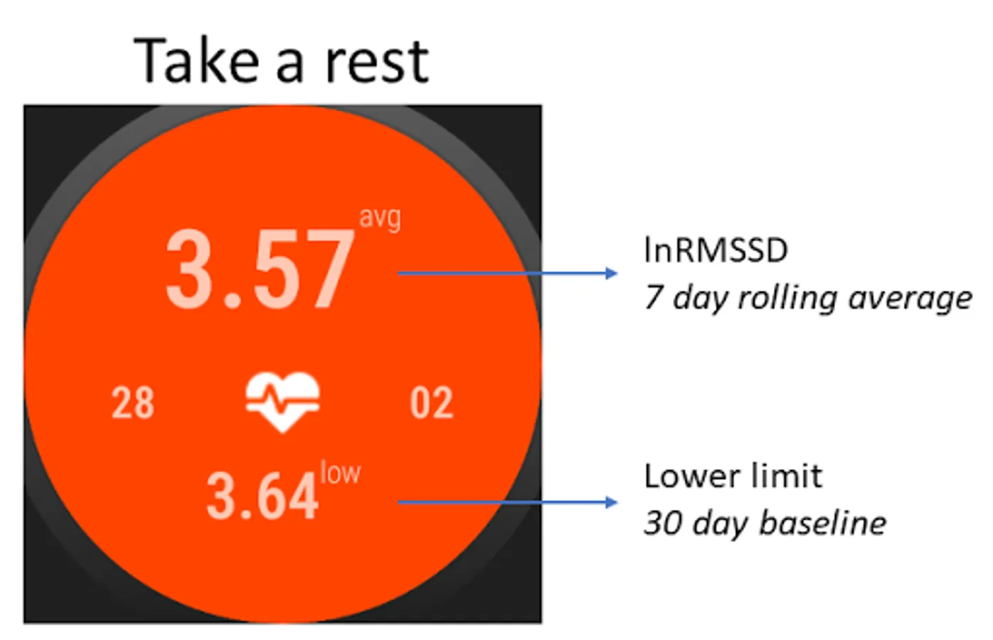 • If the 7 day average is greater than the 30 day baseline, you can train moderate or hard. If the 7 day average is less than the 30 day baseline, you should train easy or take a day off.