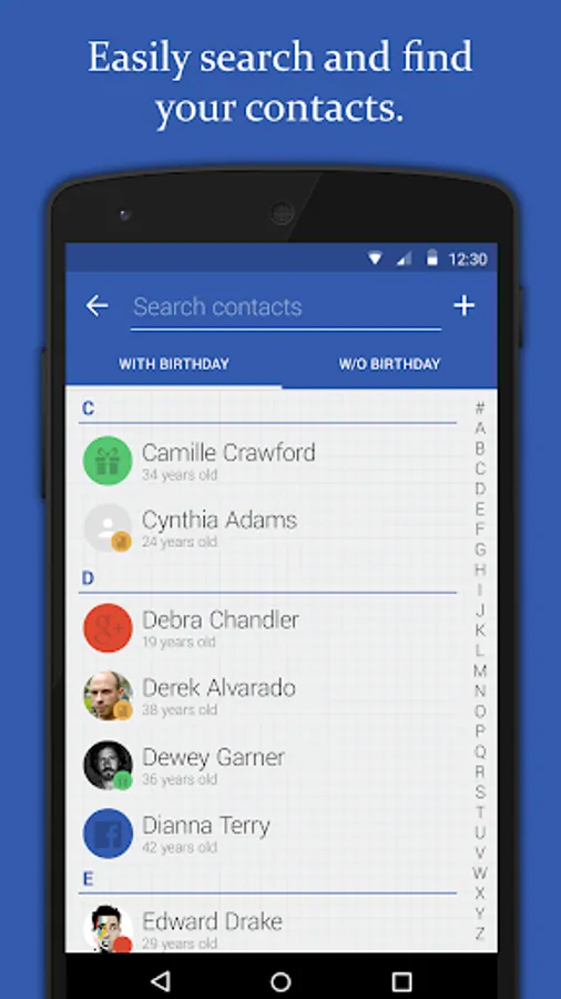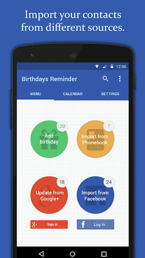 You can import birthdays directly from your phonebook or Facebook account. In addition you can add them manually, edit and merge them to each other.