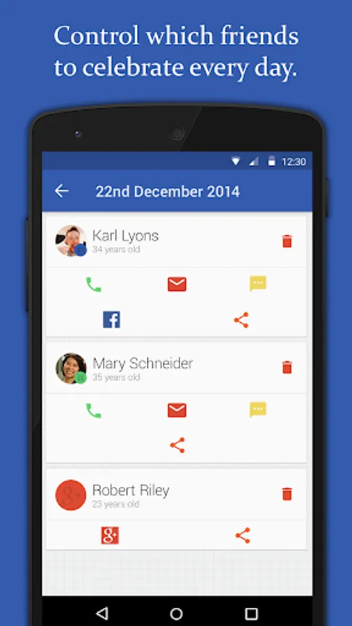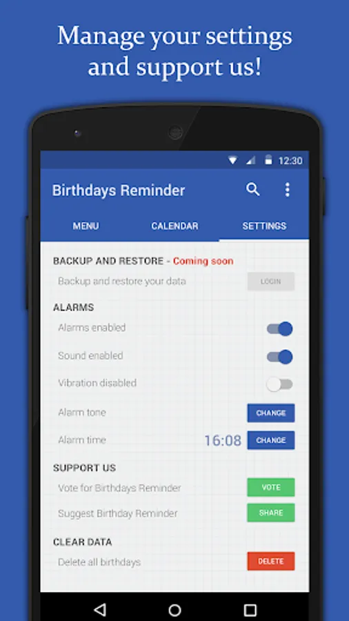 Choose when to be notified for each friend until 1 week in advance. In this way you will have time to prepare the surprise for your them. You can set alarm for all friends or you can easily customize each friend's notification type.