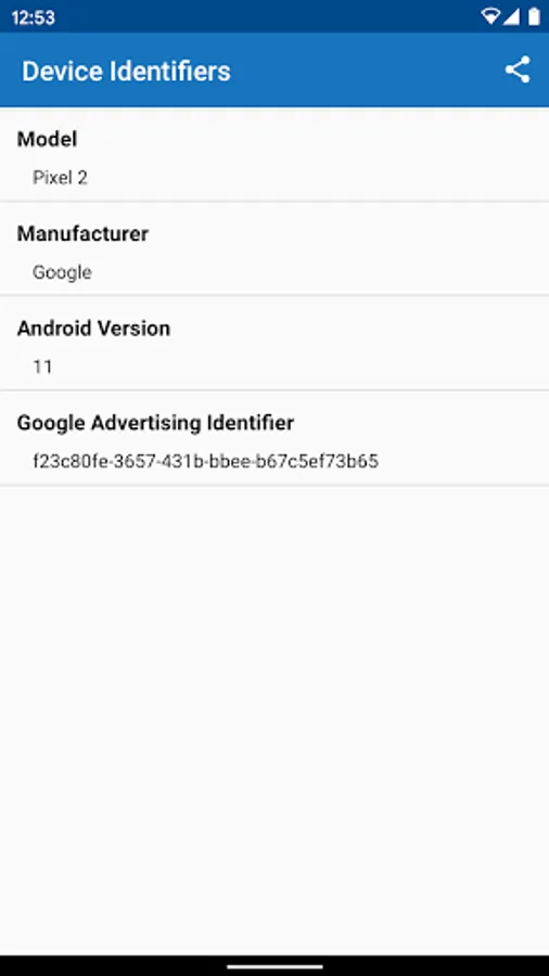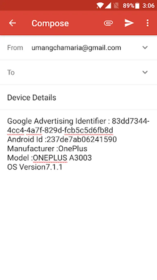 View Device Identifiers namely, Google Advertising Identifier, Android Id, Model, Manufacturer, OS version and share these identifiers over an email.