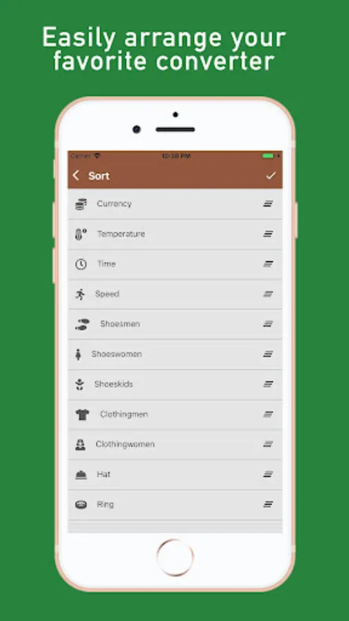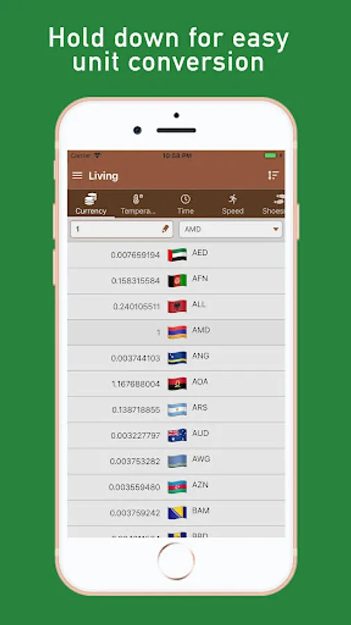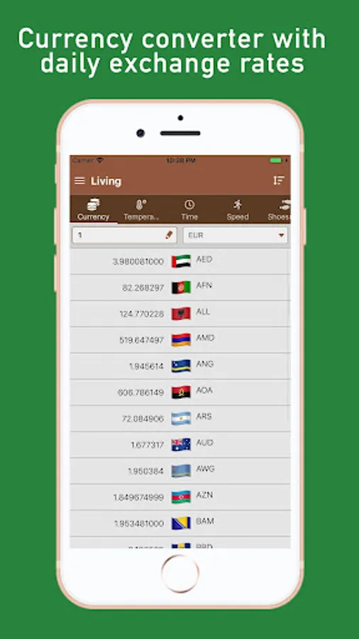 - Living : exchange rate, temperature, time, speed, shoes, clothing, hat, ring