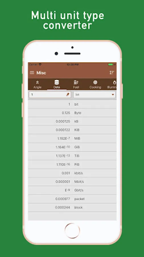 - Misc. : angle, data, fuel efficiency, cooking, illuminance, radiation, prefix, binary, time zone, blood sugar, hardness, AWG