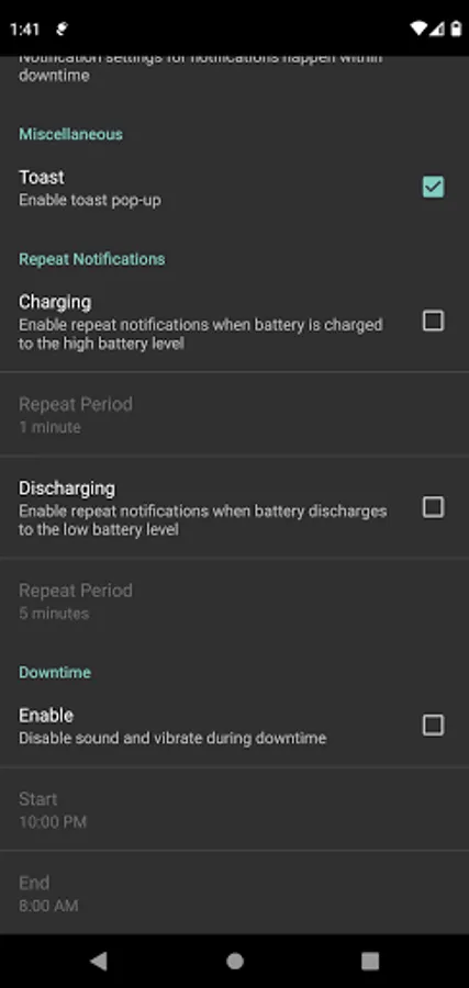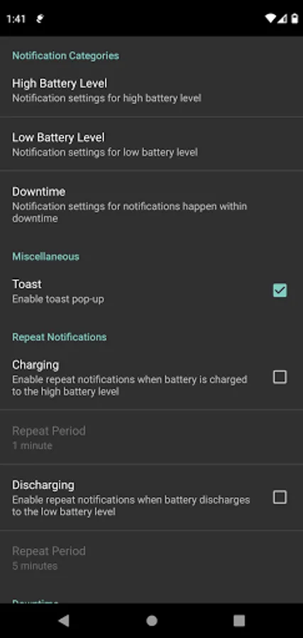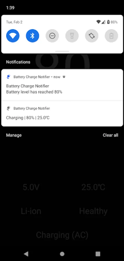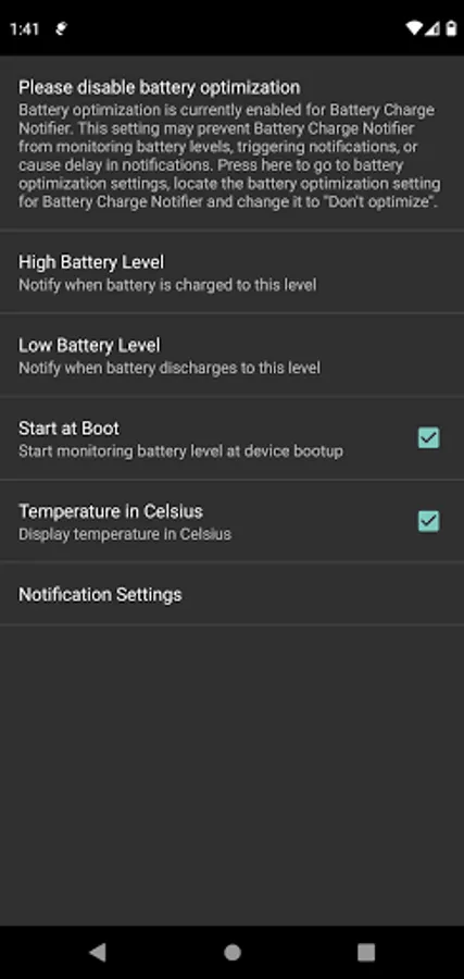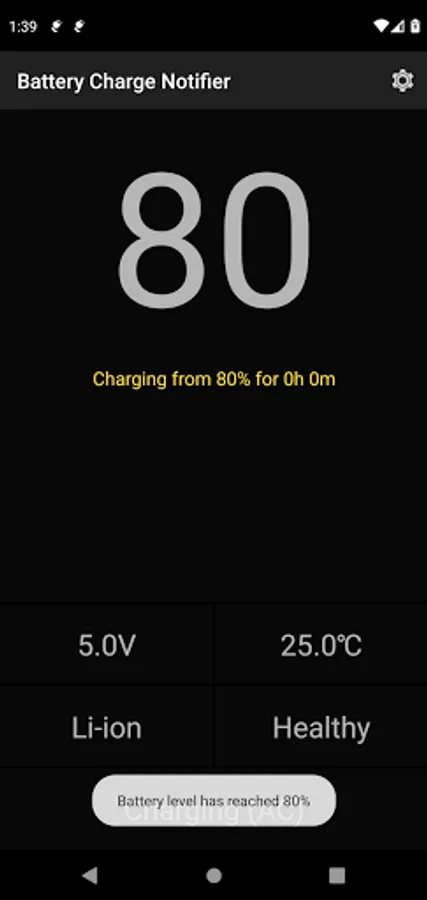 Light weight app that notifies user at user defined battery levels to either charge the device, or to unplug and stop charging. This helps in observing the 40-80 rule of Li-ion batteries.