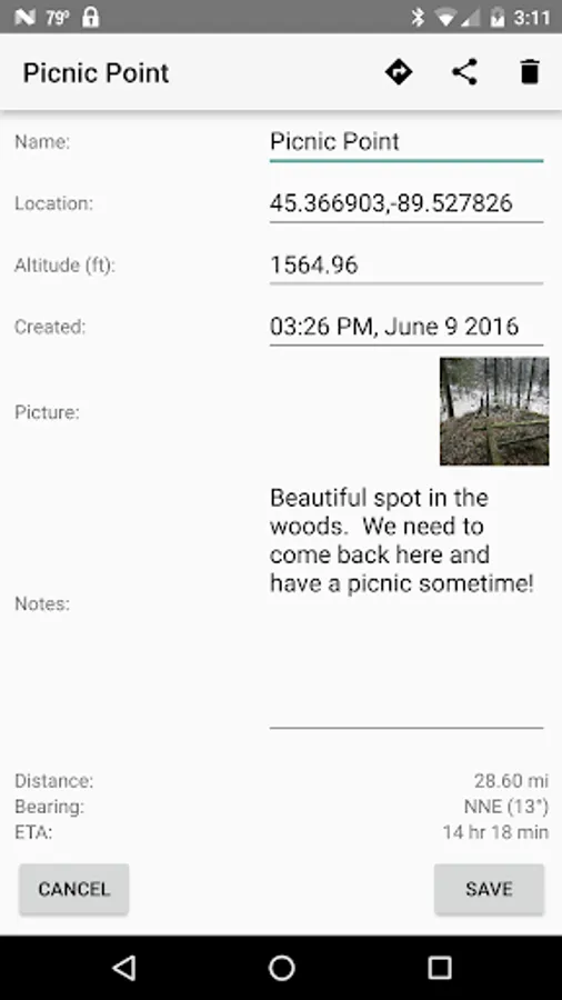 • Save up to twelve (12) waypoints including name, location, altitude, picture and notes.