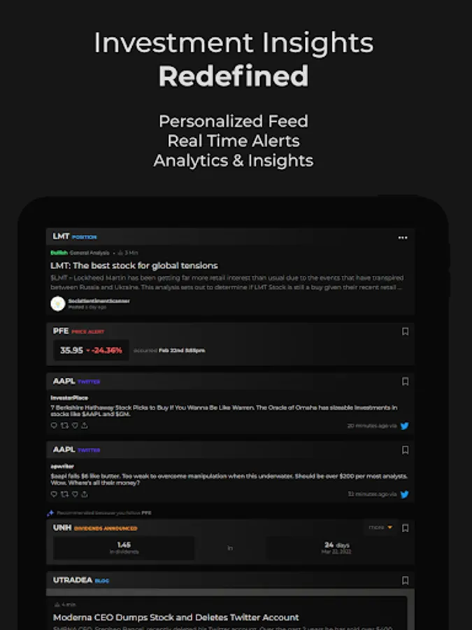 • Gain access to real-time stock market data for all of your investment tracking including finance summaries, Tradingview charts, balance sheets, performance, news, social streams, and much more!