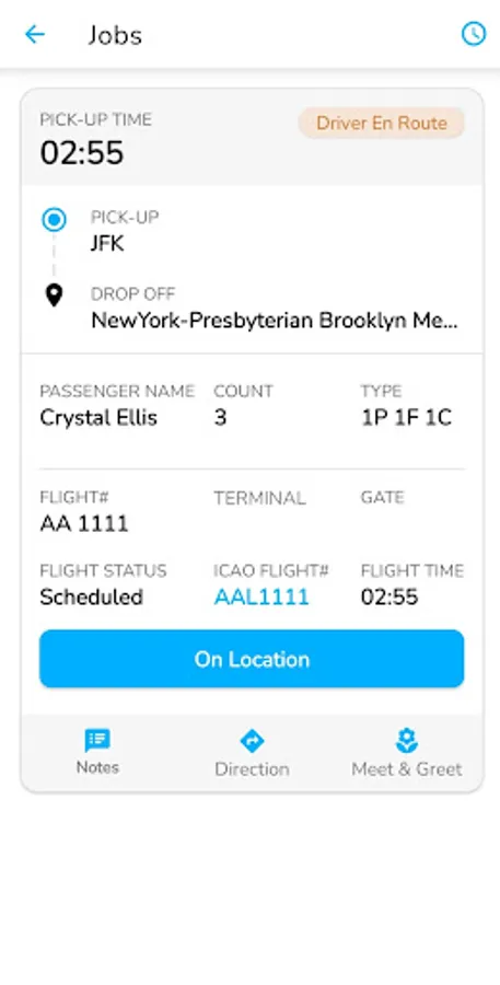 As part of ride management, a driver gets a new job, accepts (or rejects) it, gets details of the passengers and the pick-up location, and gets directions (with the destination pre-filled). The driver may use the features of this app to inform the dispatcher when the passengers have boarded the vehicle, or that the ride is complete and the passengers have been off-loaded. On this app, the driver has the ability to add extra charges based upon extra stops or an over-limit waiting period.