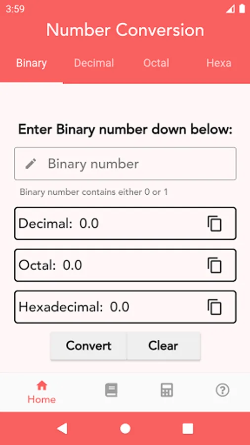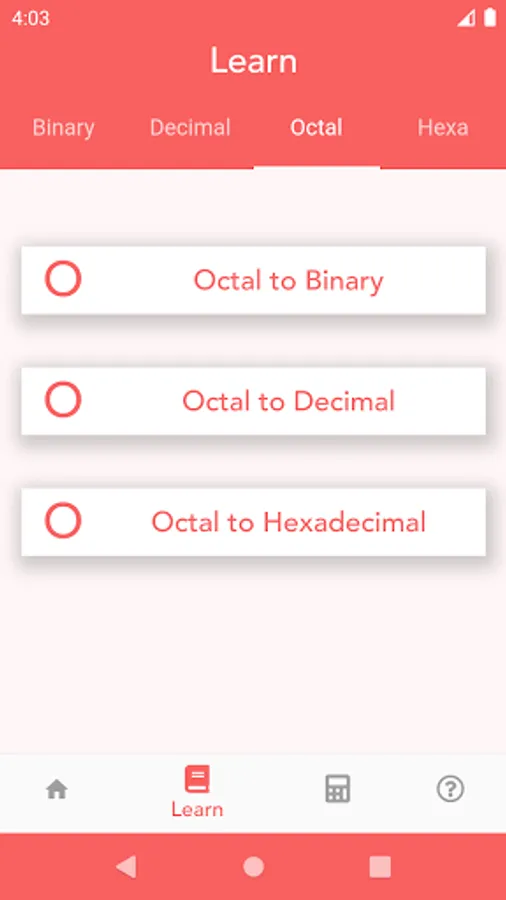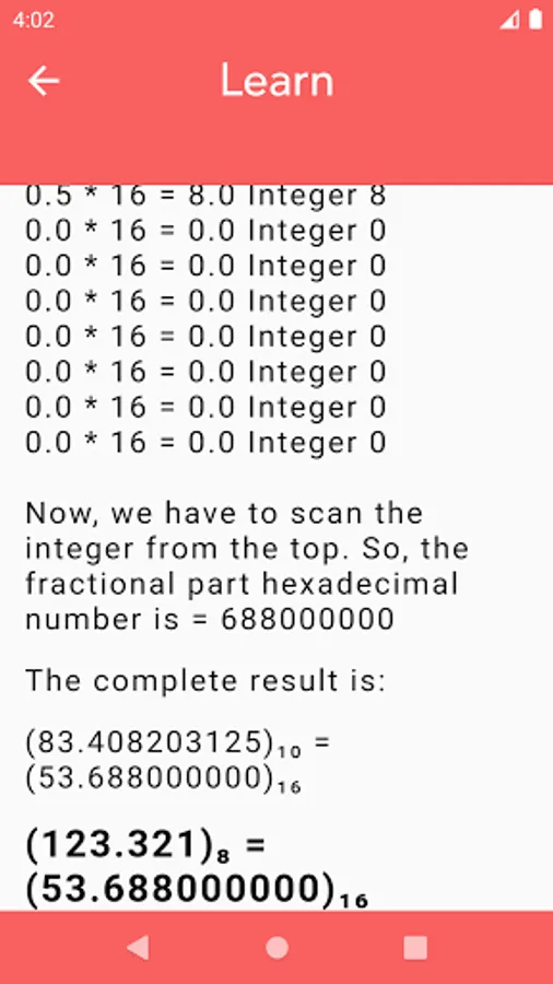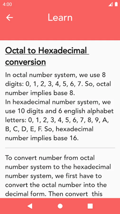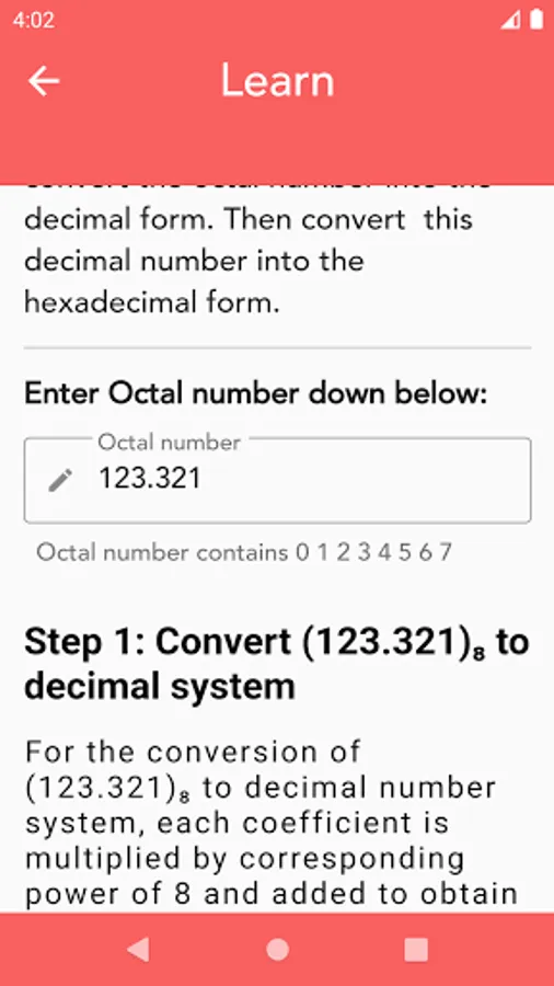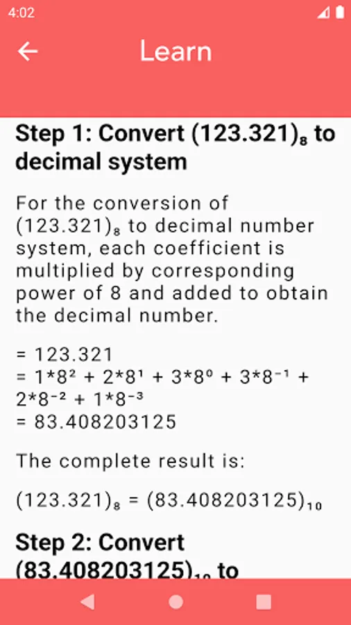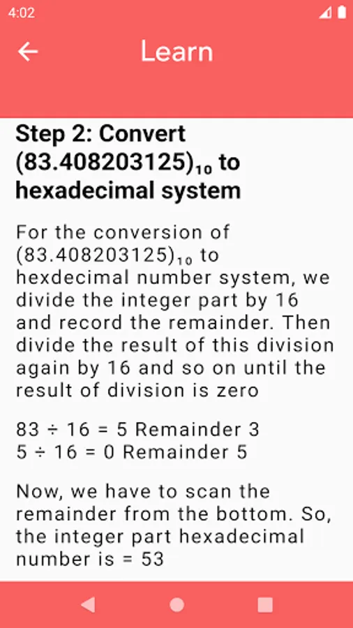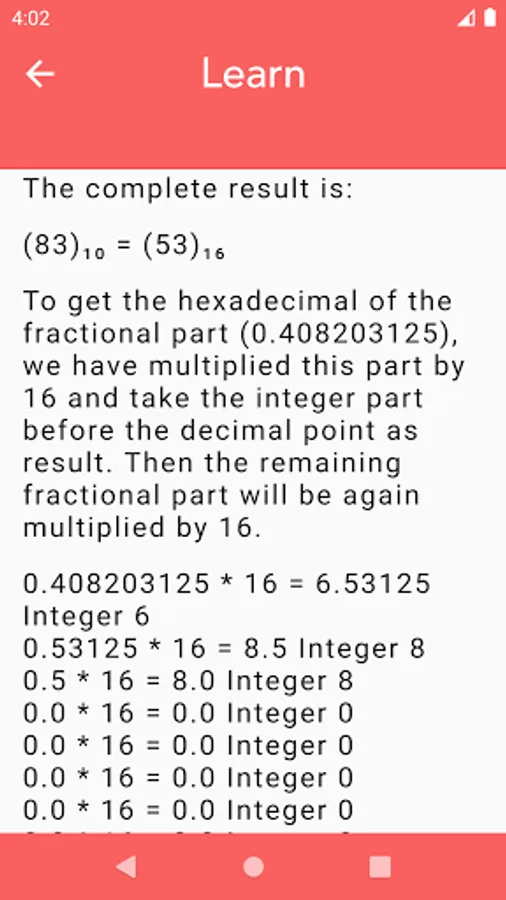 This app gives explanation with detail steps of conversion of number from one system to other. User can also learn through learn section where we have divided sections for your simplicity