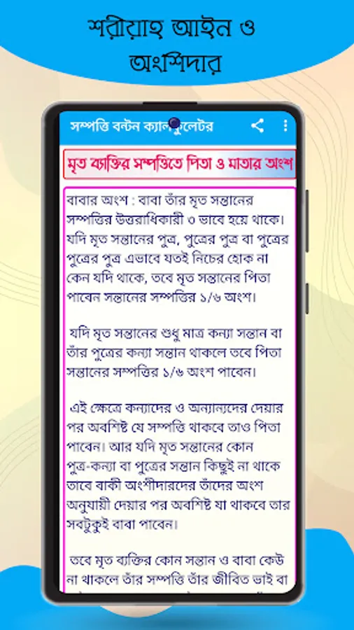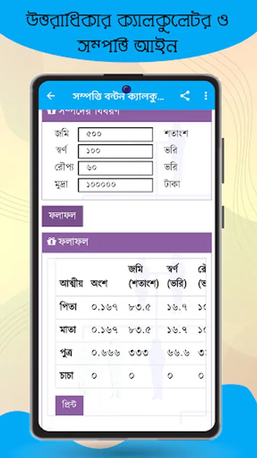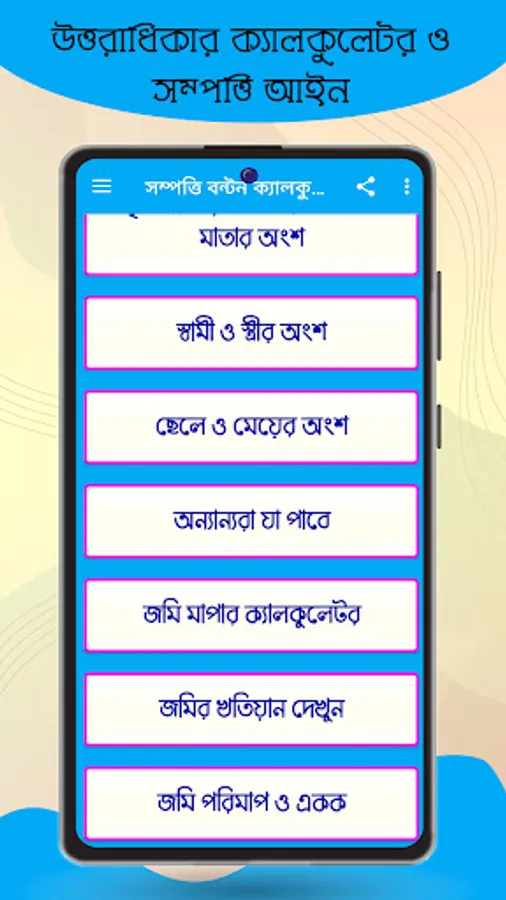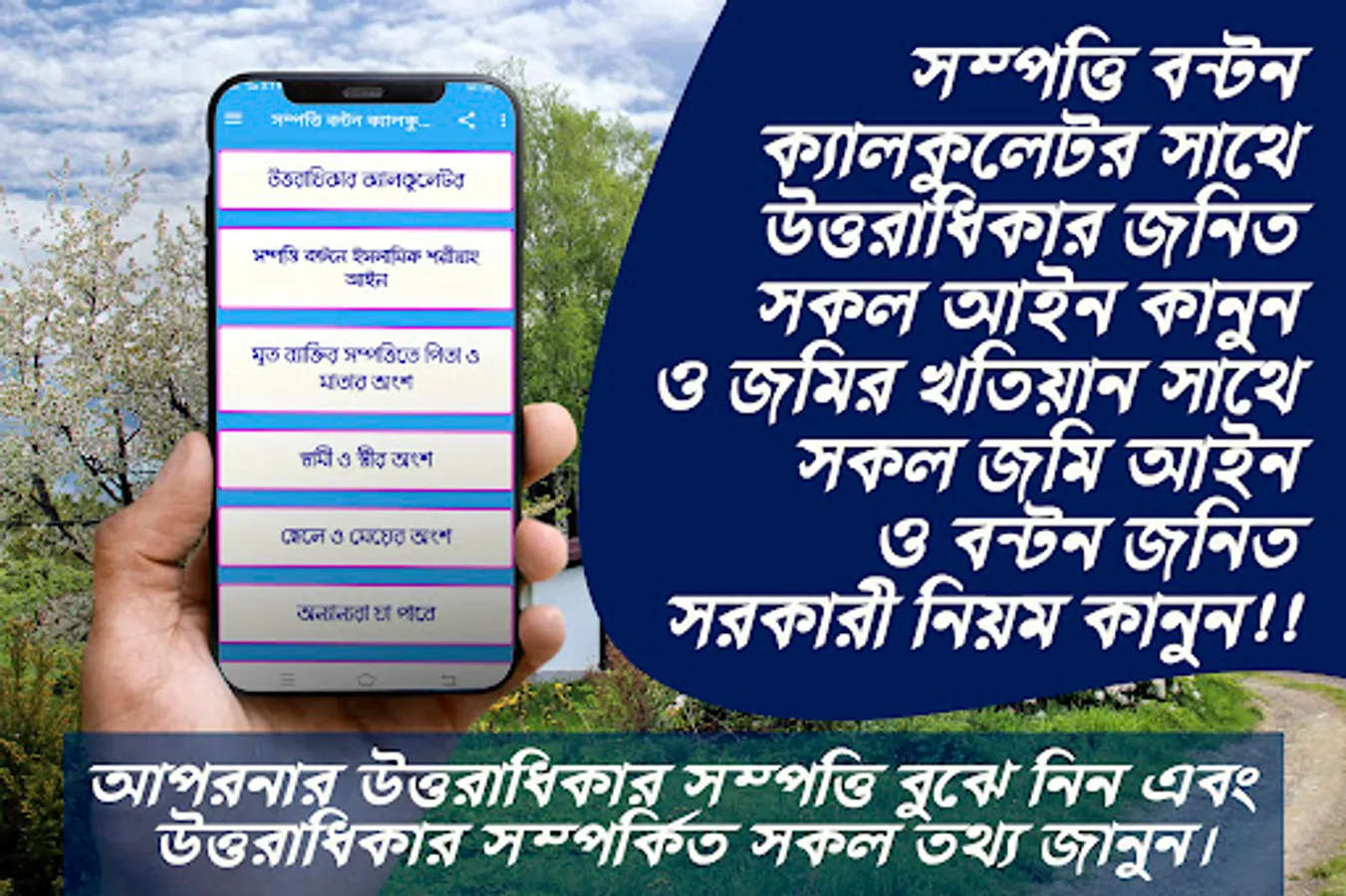 Property distribution calculator or Inheritance calculator app is a great app to view land registry online with all laws related to inheritance. This property distribution calculator app covers property transfer law and Muslim Shariah law including uttoradhikar (Muslim inheritance property calculation). Now you can see how much share you have in the property left by your parents including uncles/in-laws from this inheritance calculator or inheritance apps.
