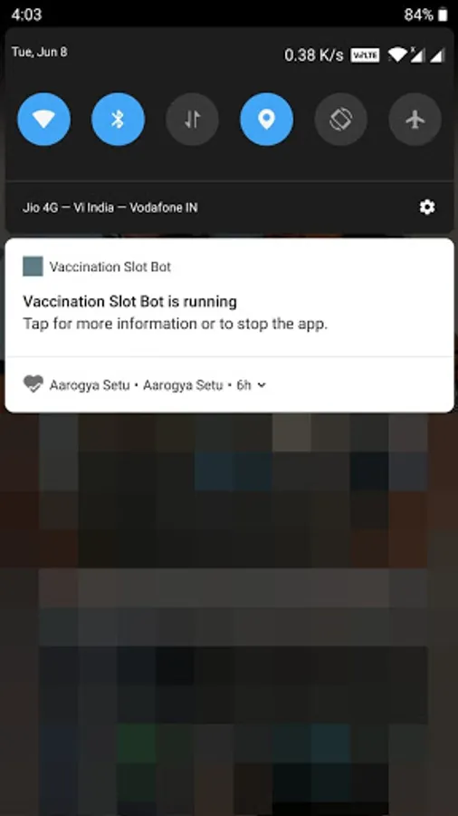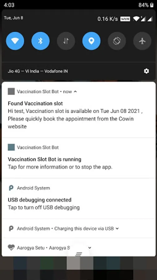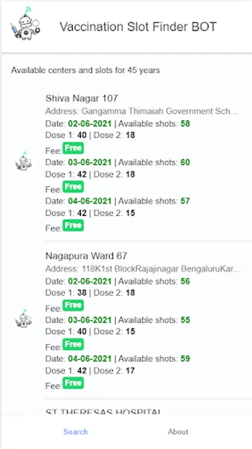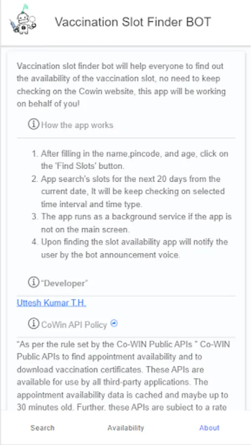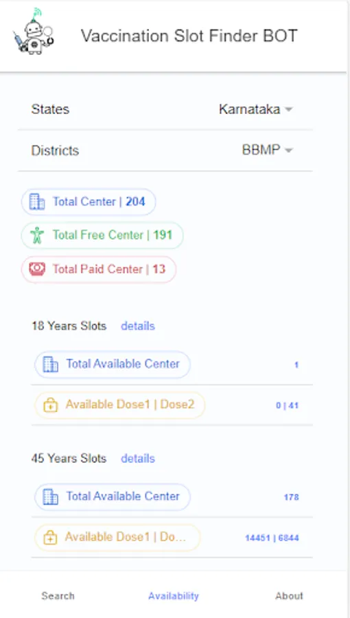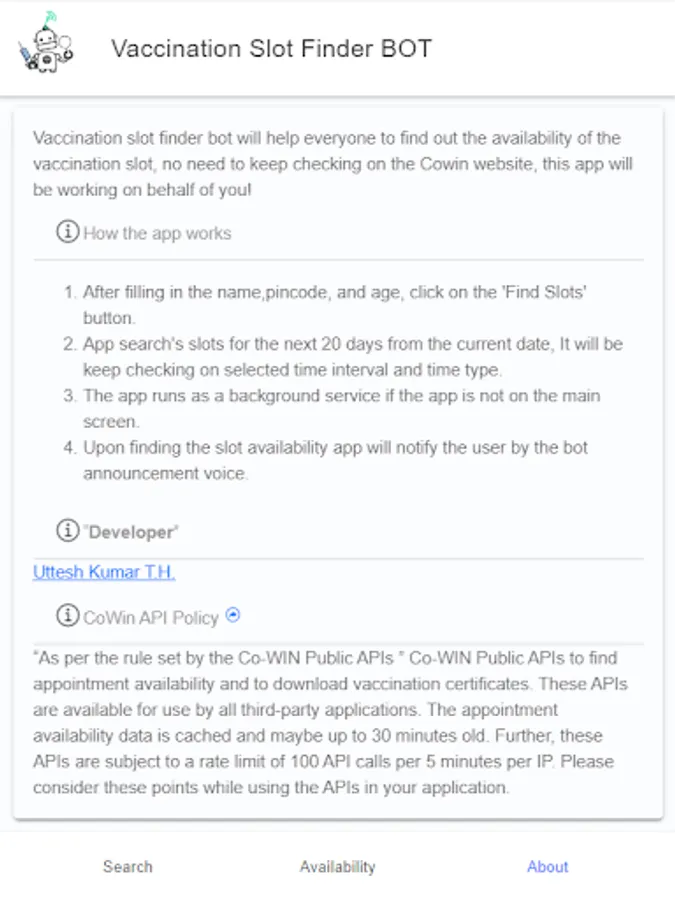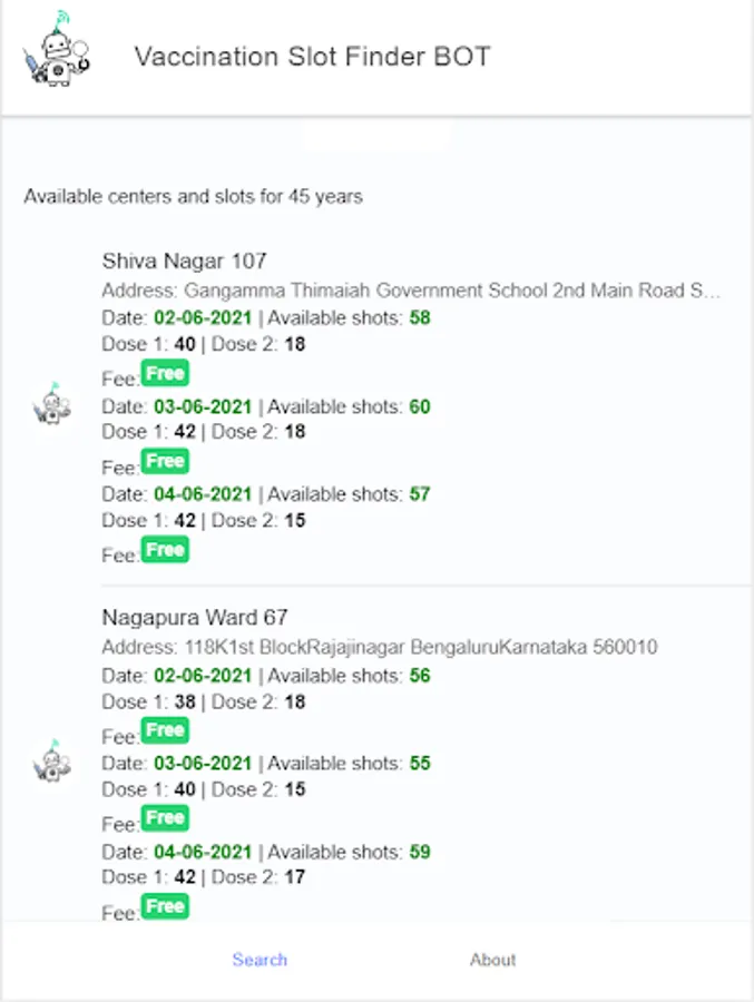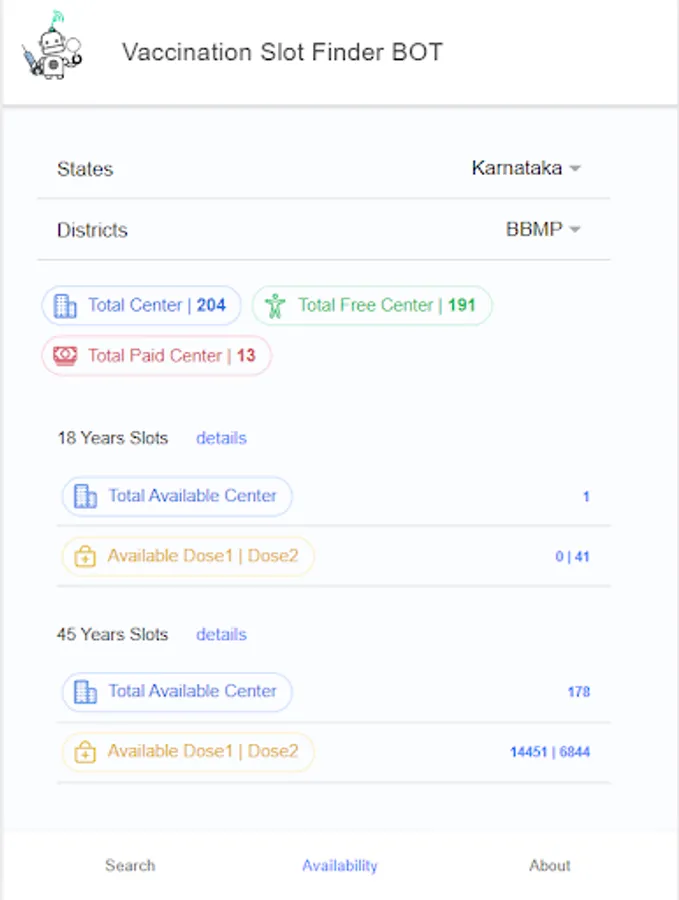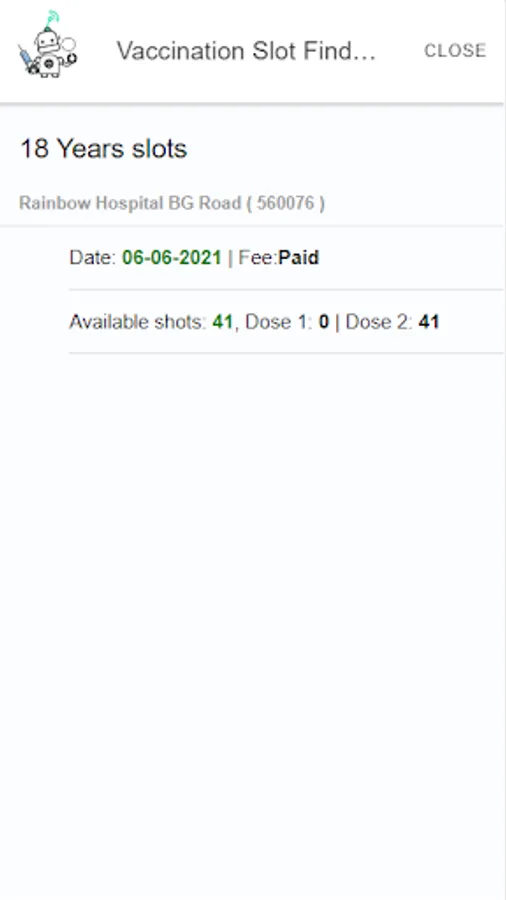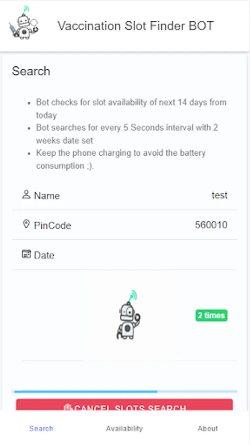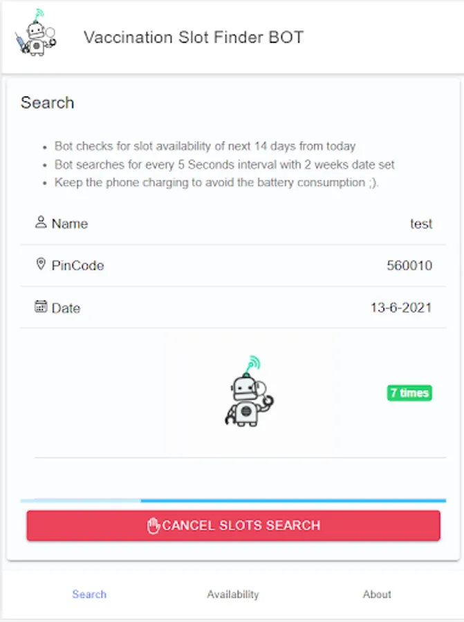 4. Upon finding the available slot, app will notify the user by the bot announcement text and voice.