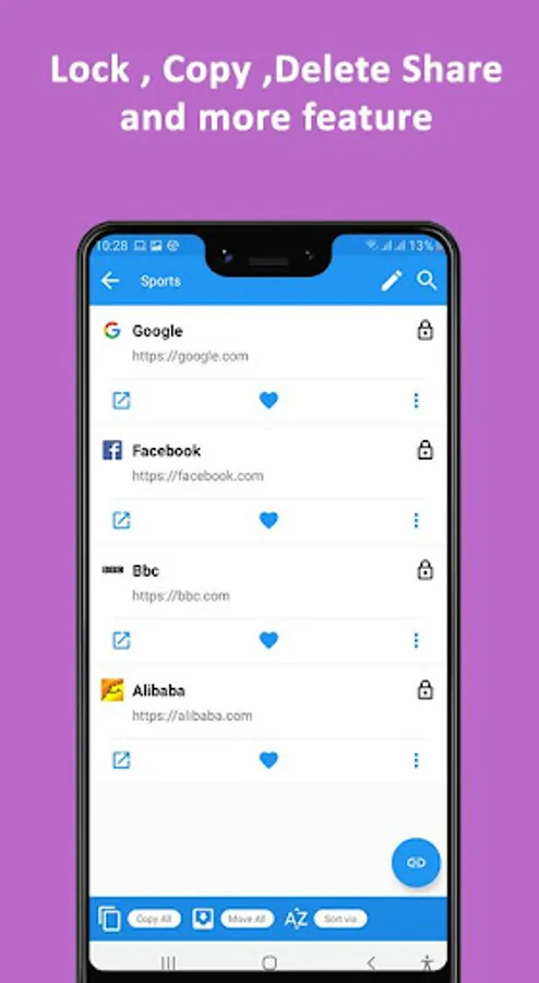 Bookmarks of all web urls lets you store unlimited links of articles, news-posts, websites, or any web-page you found interesting over the internet at one place. Save your favorite sites and go to sites with one click.