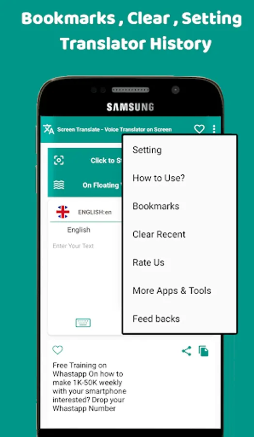 Screen translator is a very advanced feature of the android device which easily captures and copies text from any format of the screen and paste them into our translator and understand them. It easily gets a text from images of the device and directly capture picture from camera and copy text from it and also it gets a text from a web page by clicking the floating button and translate them in your required language.