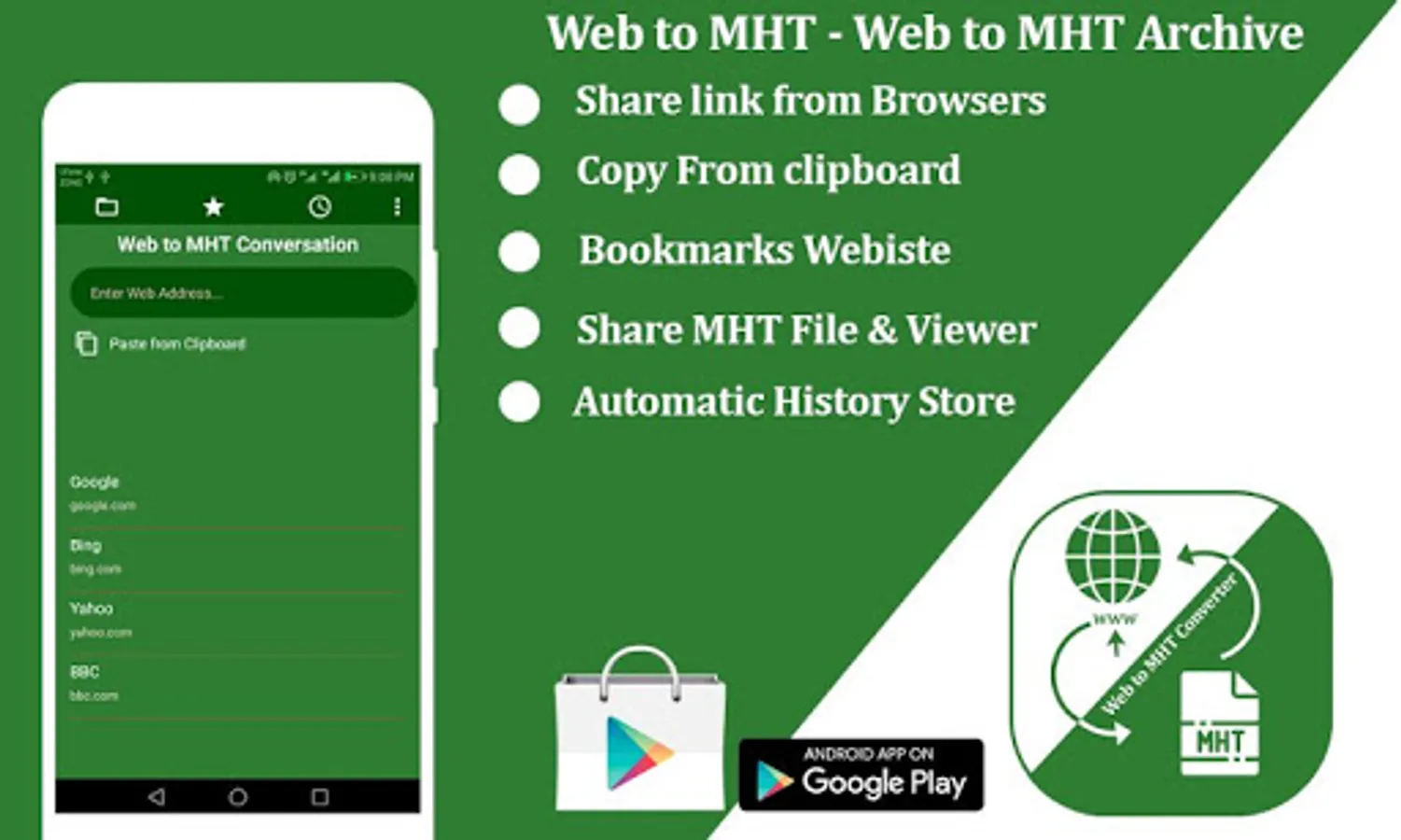 MHT/MHTML Viewer & reader: MHT/MHTML Creator is an application that provides way to preview websites and other web article saved for offline reading as well as MHT/MHTML downloaded files on android devices. The file which have mht extension or mhtml extension then easily you can open and view it with this application and if you want to convert web page to mht and mhtml then you can convert web to mht and mhtml format with in second.